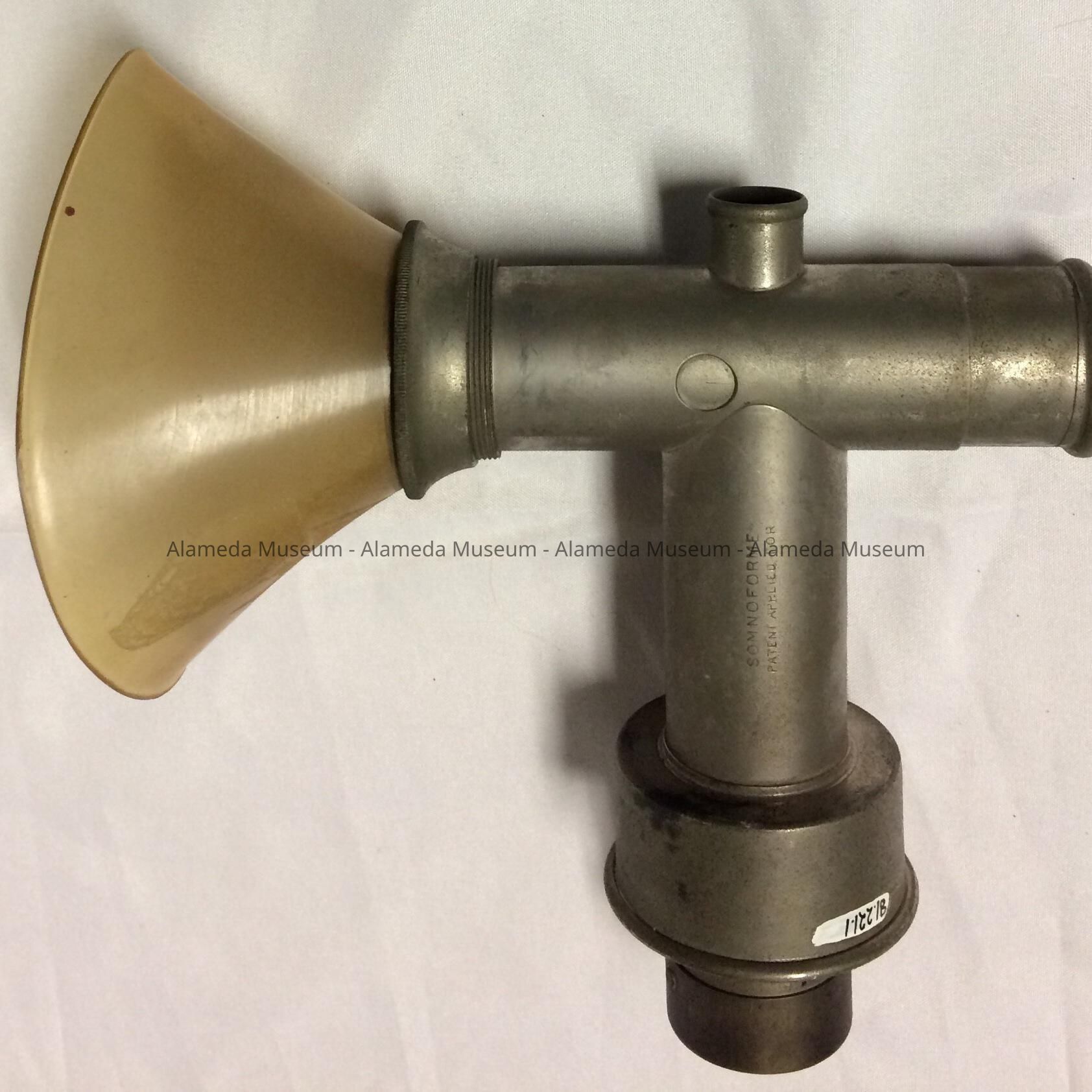 Description: Attachment of the mask is nickel plated and is engraved with the words "somnoforme, Pat. Appl'd for". It has a celluloid nose and mouth mask, Interior has fine wire mesh.