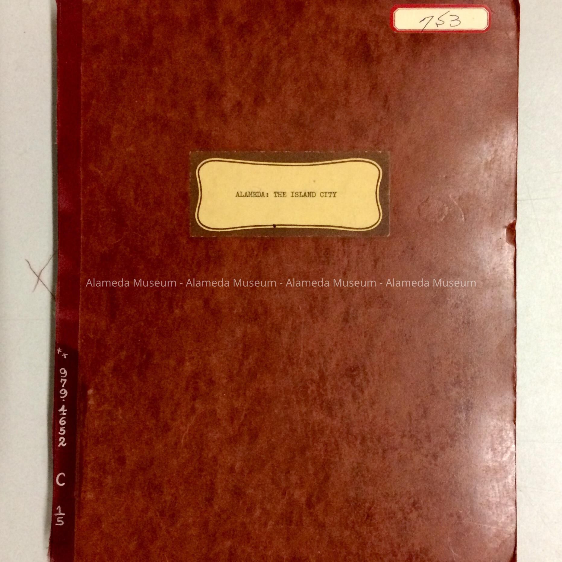 TYPEWRITTEN ROUGH DRAFT, IN LOOSE- LEAF BINDER, WITH SOFT BROWN-COLORED PRESSBOARD COVER. COVER HAS TYPEWRITTEN CAPTION, "ALAMEDA --- THE ISLAND CITY."