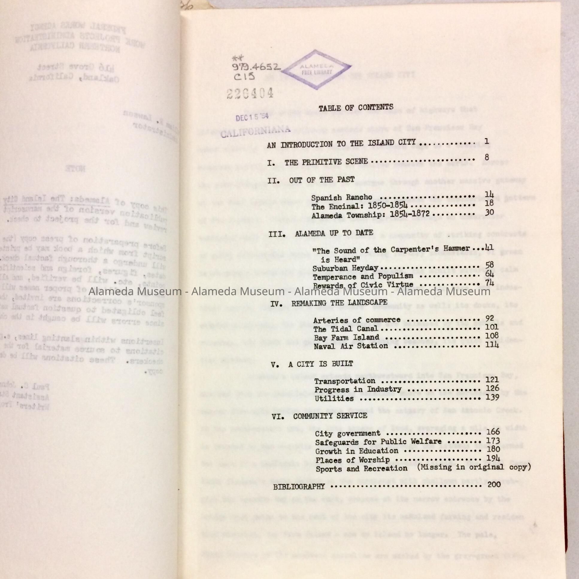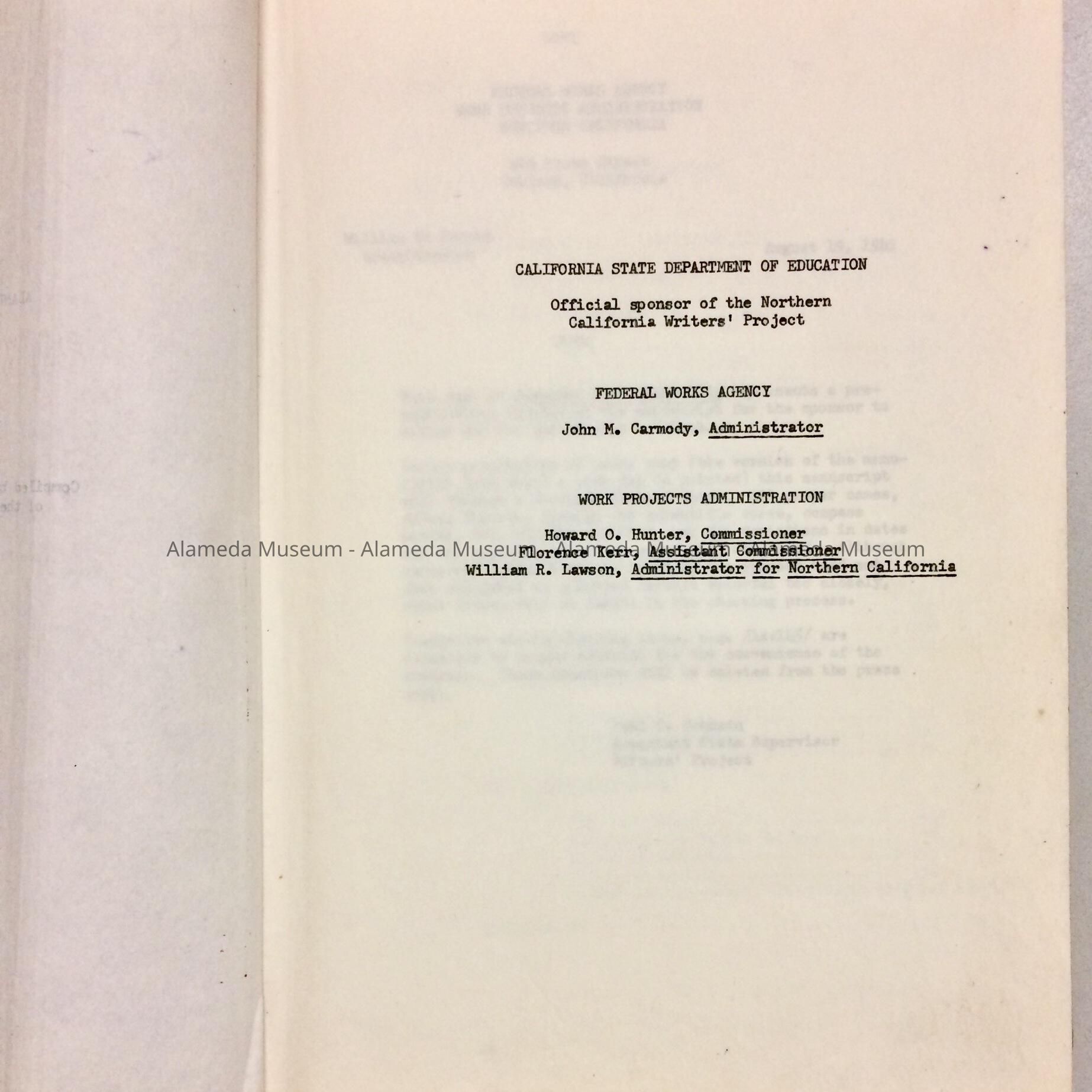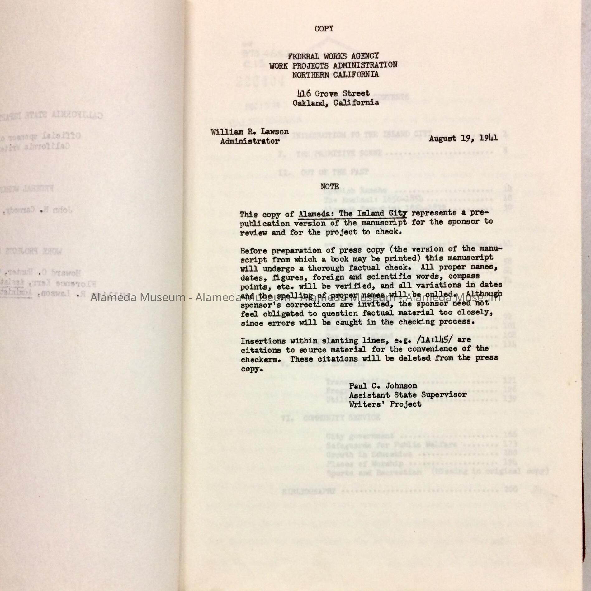 ROUGH DRAFT COMPILED BY WORKERS OF THE WRITERS' PROJECT OF THE WORKS PROJECT ADMINISTRATION (WPA) IN NORTHERN CALIFORNIA. THE CITY OF ALAMEDA CO-SPONSORED THE DRAFT IN 1941. THE DRAFT WAS ORIGINALLY IN THE COLLECTION OF THE A LAMEDA FREE LIBRARY AND GIVEN TO THE ALAMEDA HISTORICAL SOCIETY. THE DRAFT WAS NEVER PUBLISHED.