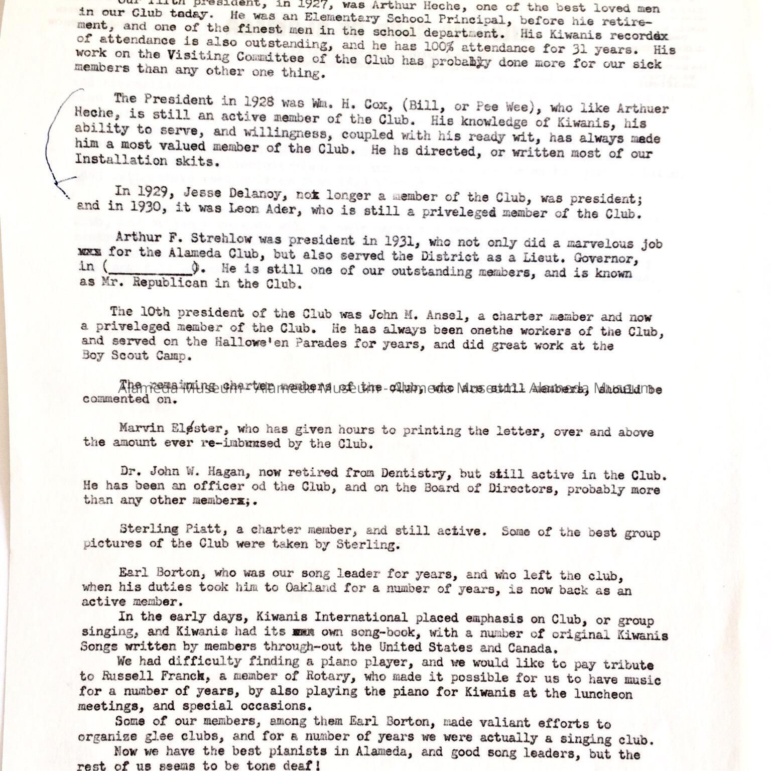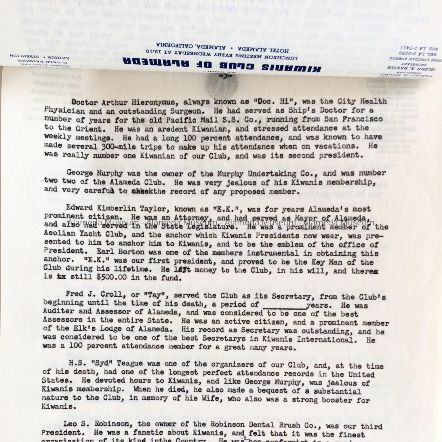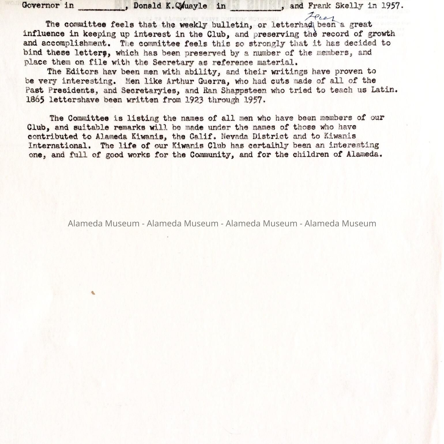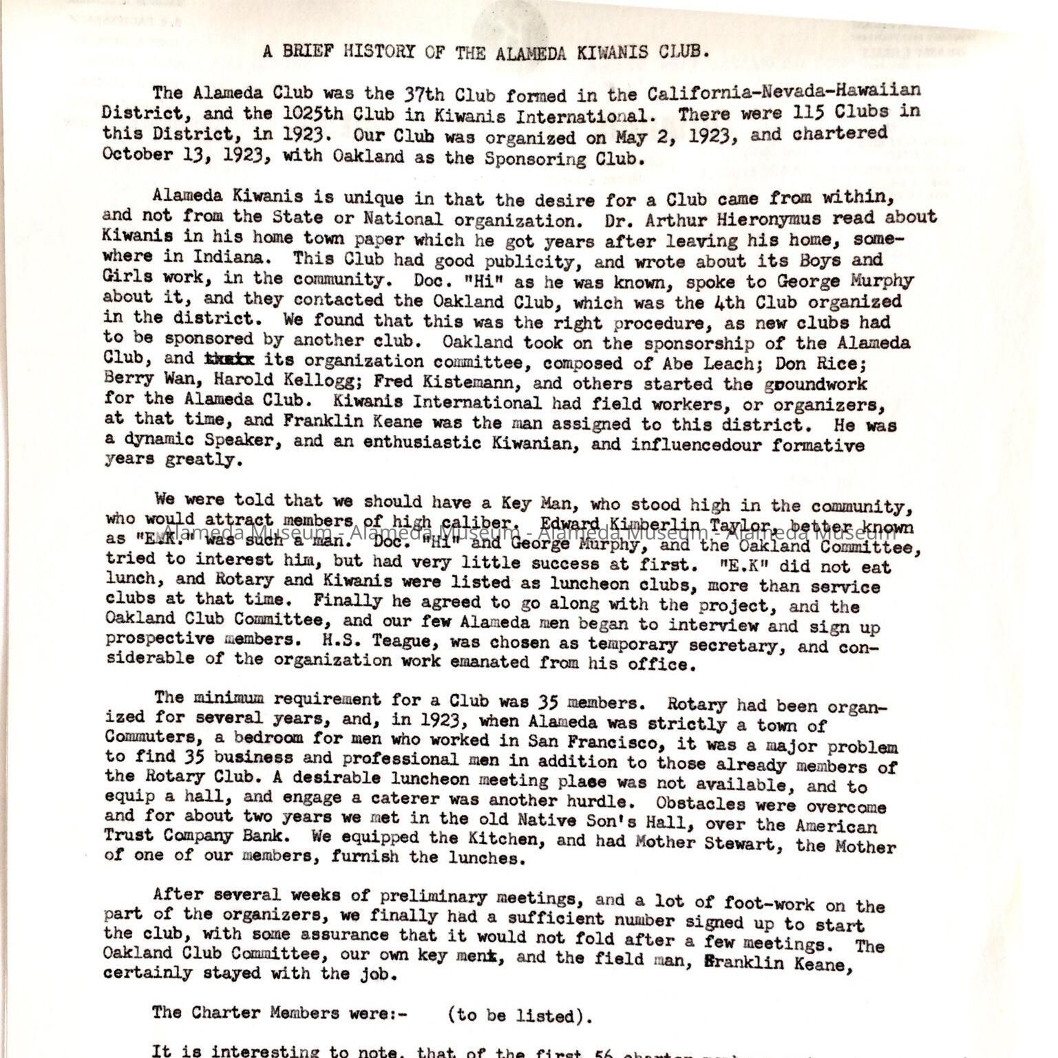 History: Rough draft which would eventually be printed in booklet form under the title "A Brief History of Alameda Kiwanis Club 1958" (00.63.1).