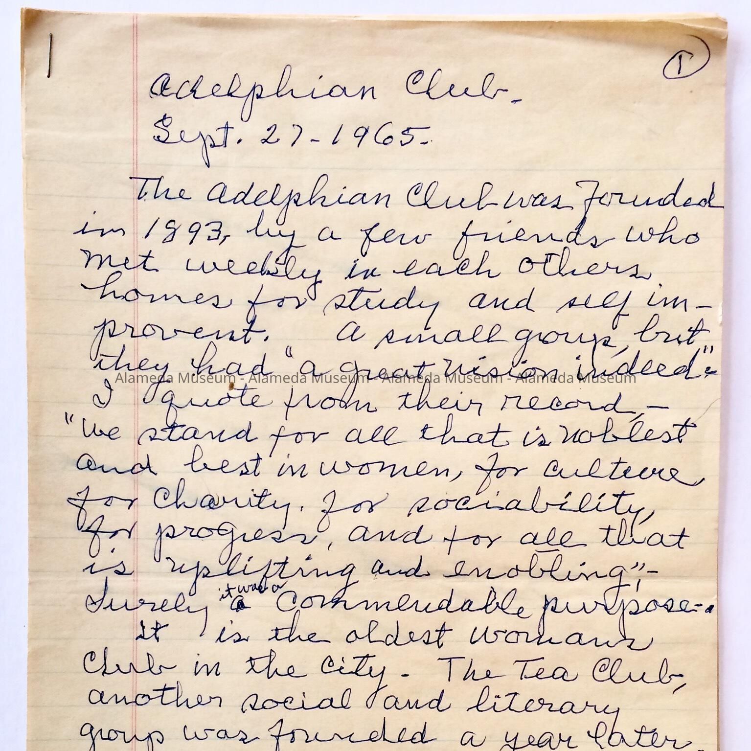 THE HANDWRITTEN SCRIPT FOR THE SPEECH PRESENTED BY THE LATE MYRTLE RICHARDSON, CURATOR OF THE ALAMEDA HISTORICAL SOCIETY, CONCERNING THE ADELPHIAN CLUB IN ALAMEDA.