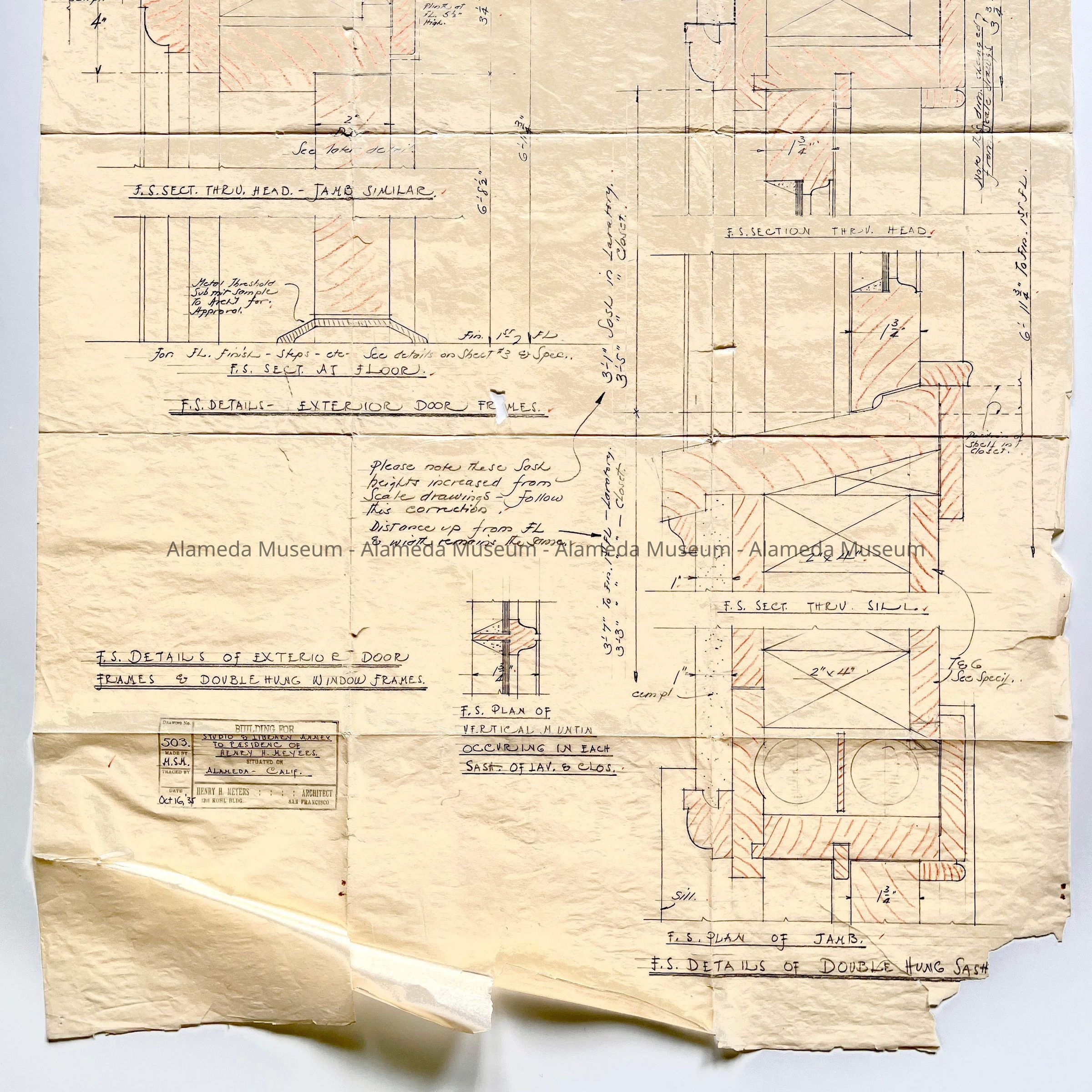 DETAILS OF EXTERIOR DOOR, FRAMES, AND DOUBLE-HUNG WINDOW FRAMES, STUDIO AND LIBRARY ANNEX TO THE RESIDENCE OF MR HENRY H MEYERS, 2021 ALAMEDA AVENUE, ALAMEDA, CA. PLANS WERE DRAWN BY MILDRED S MEYERS, ARCHITECT DAUGHTER OF HENRY H MEYERS, AND DATED OCTOBER 16, 1935.