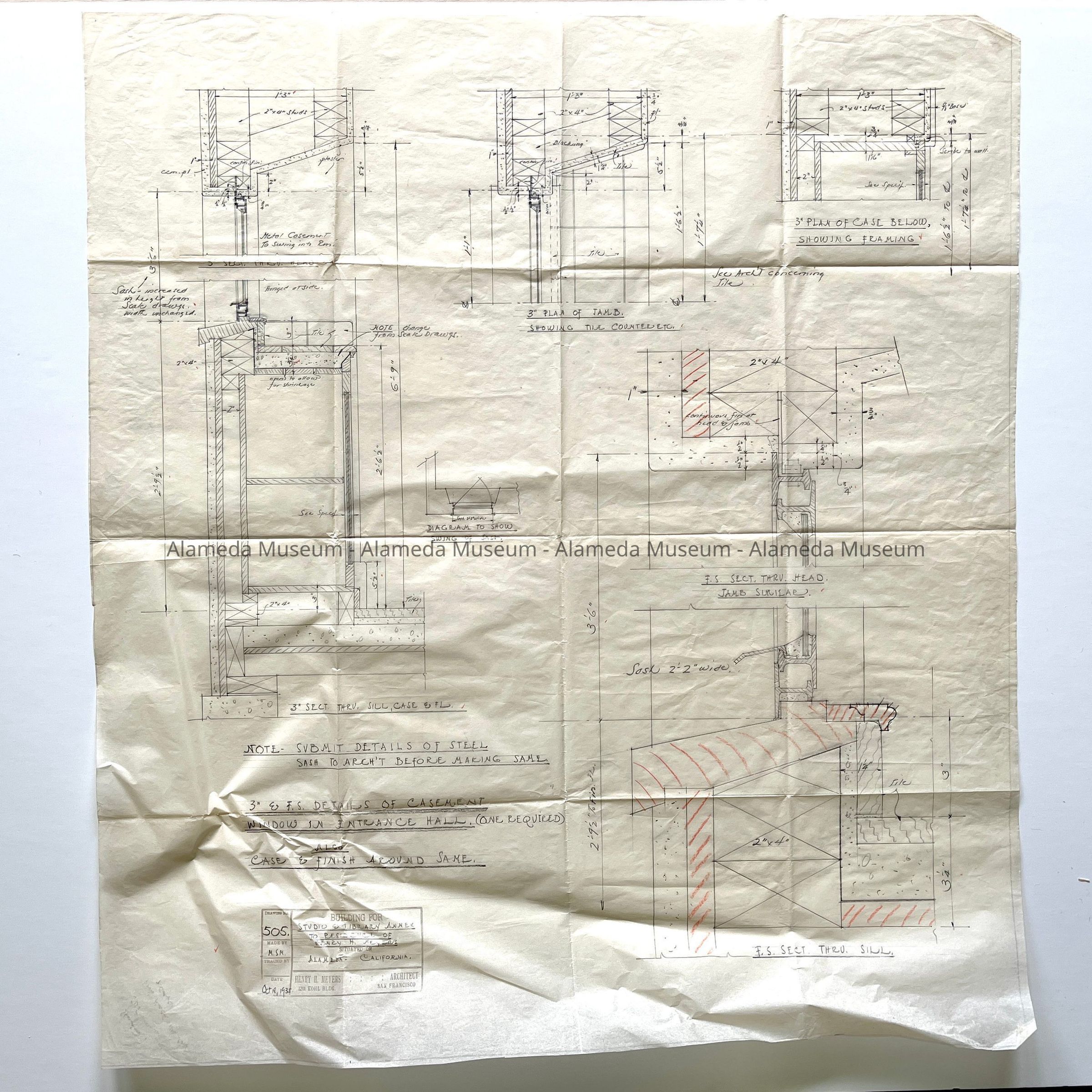 PLANS OF THE OPENING AND STEEL CASEMENT WINDOW, ENTRANCE HALL, STUDIO AND LIBRARY ANNEX, HENRY H MEYERS' RESIDENCE. DRAWN BY MILDRED S MEYERS, HENRY'S DAUGHTER, DATED OCTOBER 18, 1935.