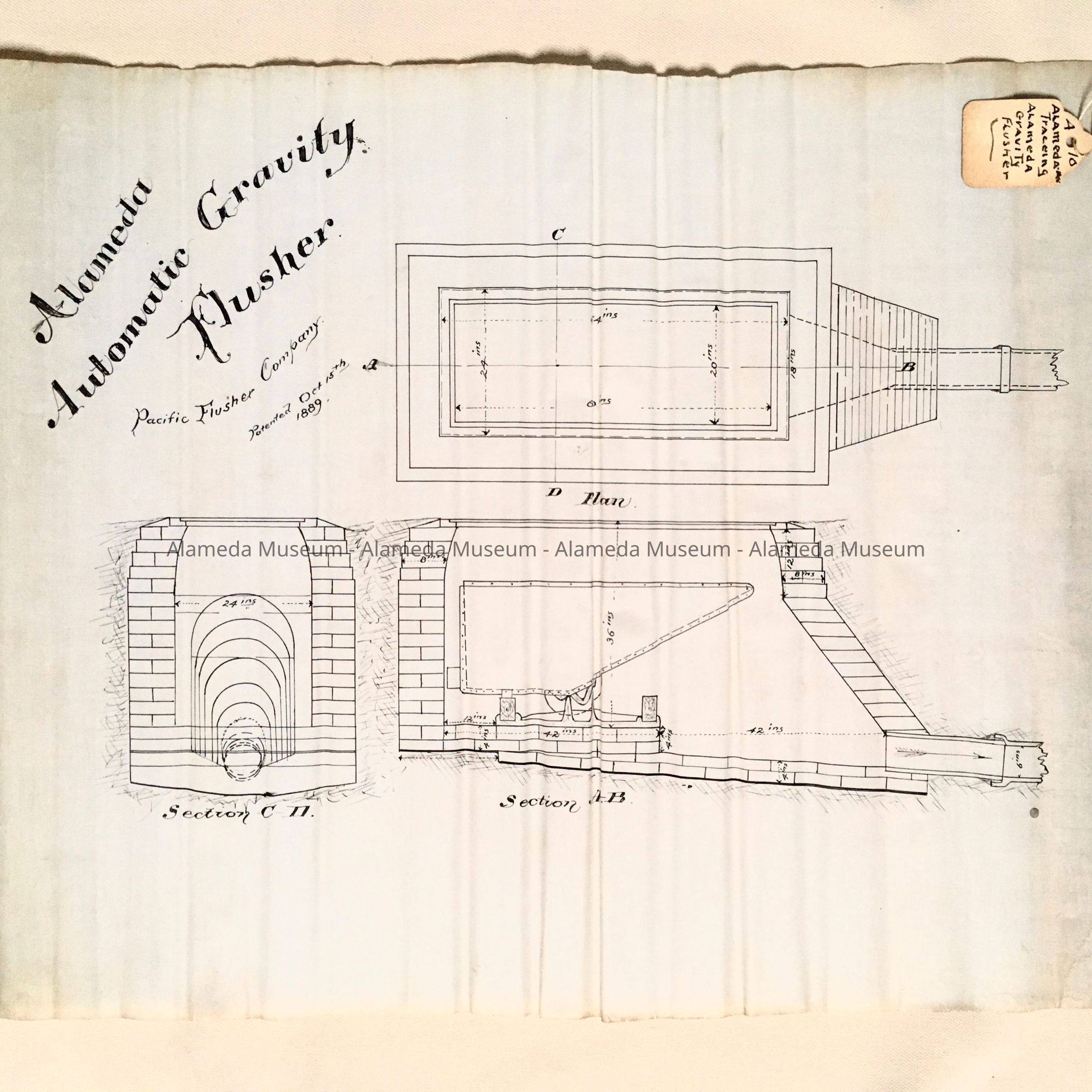 Hand-drawn schematic in black-colored ink on pale gray-colored polished linen paper with bold-printed caption, “Alameda Automatic Gravity Flusher”.