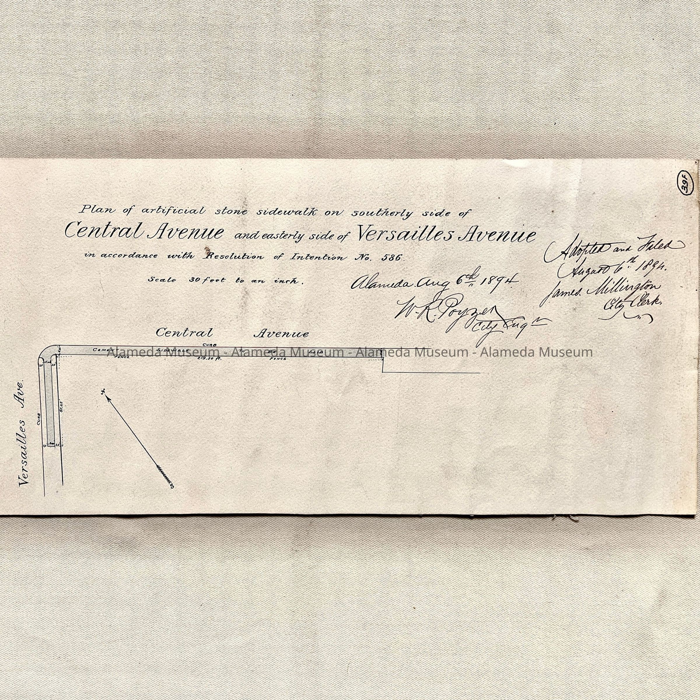 HISTORY OF OBJECT: DRAWING DEPICTING PLAN FOR ARTIFICIAL STONE SIDEWALK ON THE SOUTHERLY SIDE OF CENTRAL AVENUE, EAST OF VERSAILLES STREET, DATED AUGUST 6, 1894.