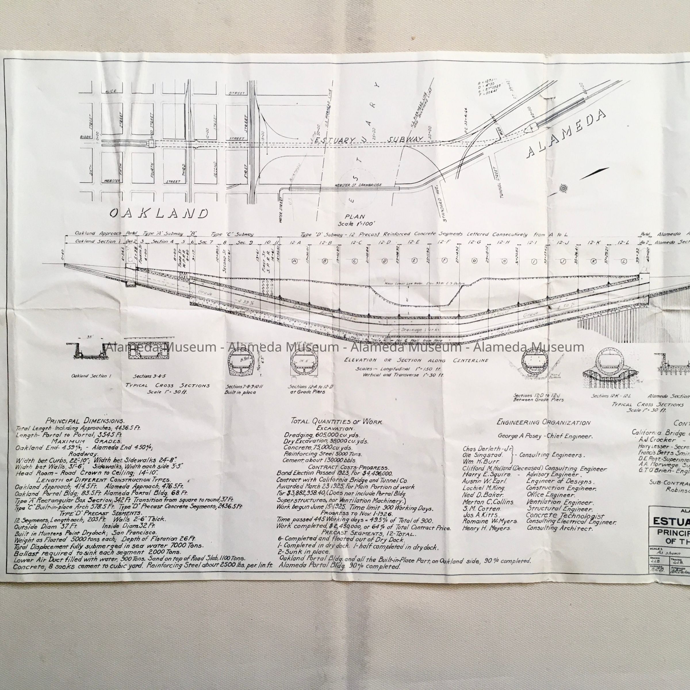 History of Object: A drawing of the estuary subway's principal project features, dated 10/27/26. The donor's grandfather, AS. A. Horwege, is listed as superintendent at Hunter's Point, SF, where the tubes were actually constructed.