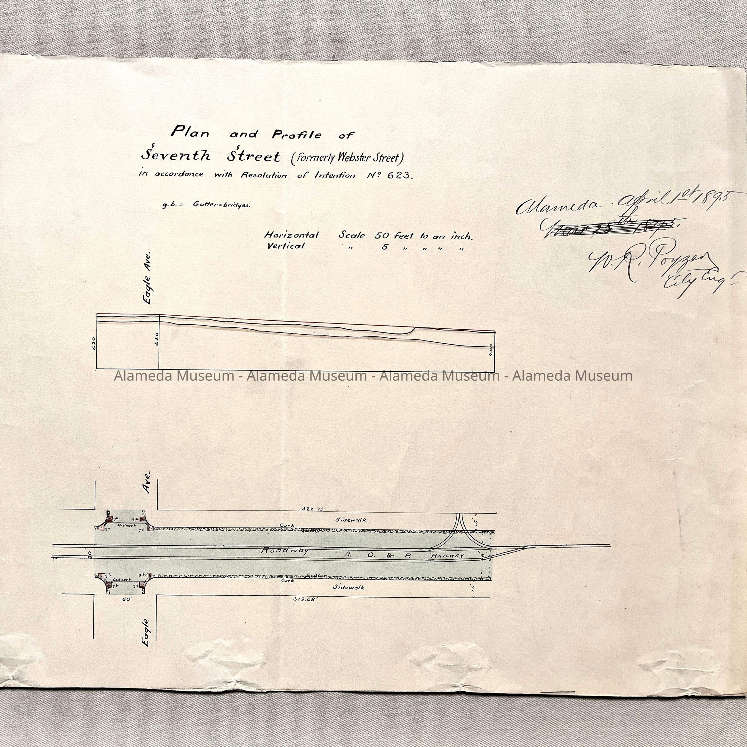 DRAWING OF THE SEWER SYSTEM ON WEBSTER STREET AND EAGLE AVENUE, ALAMEDA, CA. IT WAS SUBMITTED IN ACCORDANCE WITH (IAW) RESOLUTION OF INTENTION #623, AND DATED APRIL 1, 1895, AND SIGNED BY WR POYZER, CITY ENGINEER.