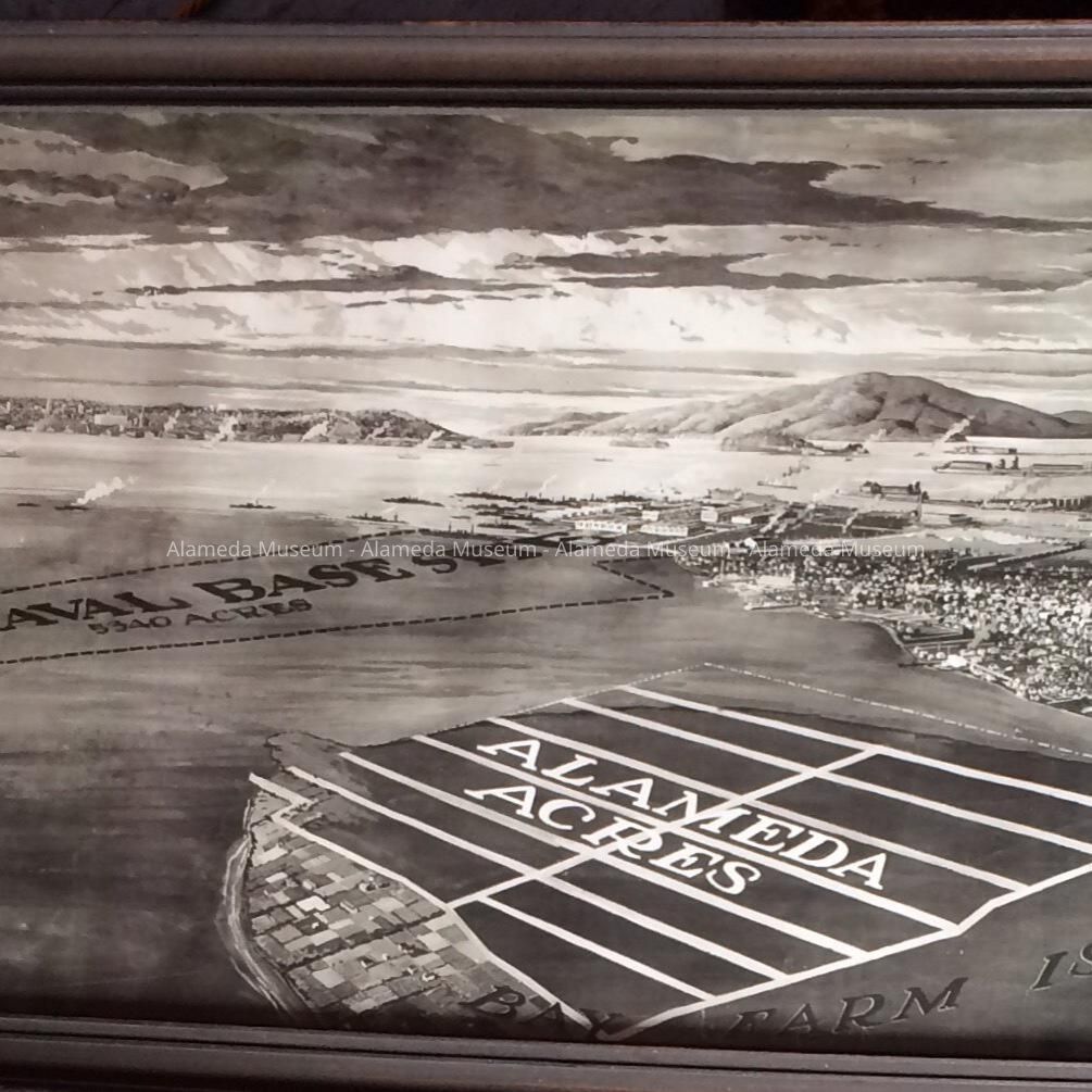 Illustration depicting a proposed development scheme for Bay Farm Island, Alameda, entitled "Alameda Acres." Also included is an unusually shaped proposed "Alameda Naval Base" site.