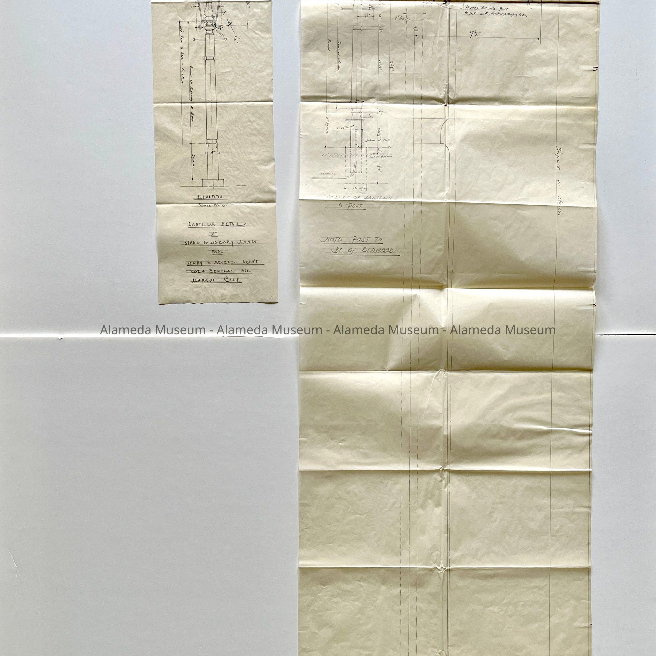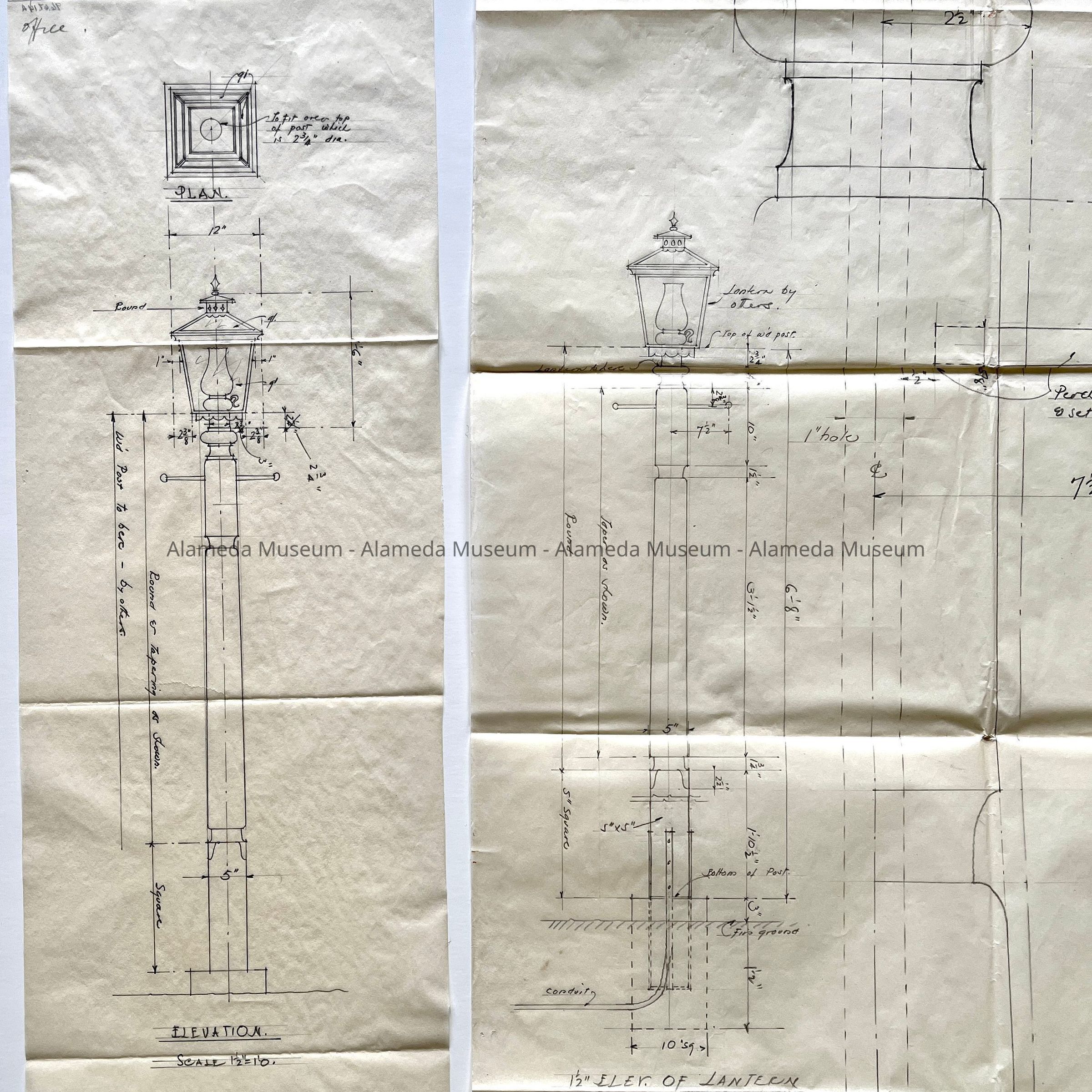 DRAWINGS OF ORNATE-MOUNTED LAMP POST ON PATH LEADING TO STUDIO-LIBRARY ANNEX, 2024 CENTRAL AVENUE, ALAMEDA, CA. THE ANNEX IS LOCATED AT THE REAR OF THE HENRY H MEYERS' RESIDENCE, 2021 ALAMEDA AVENUE, ALAMEDA, CA.