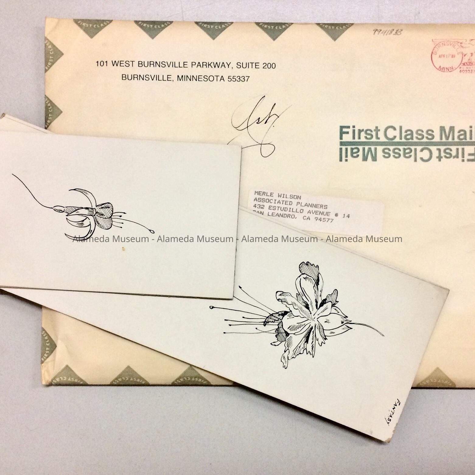 Description: Original envelope containing various size pen and ink drawings mailed to Merle Wilson.
