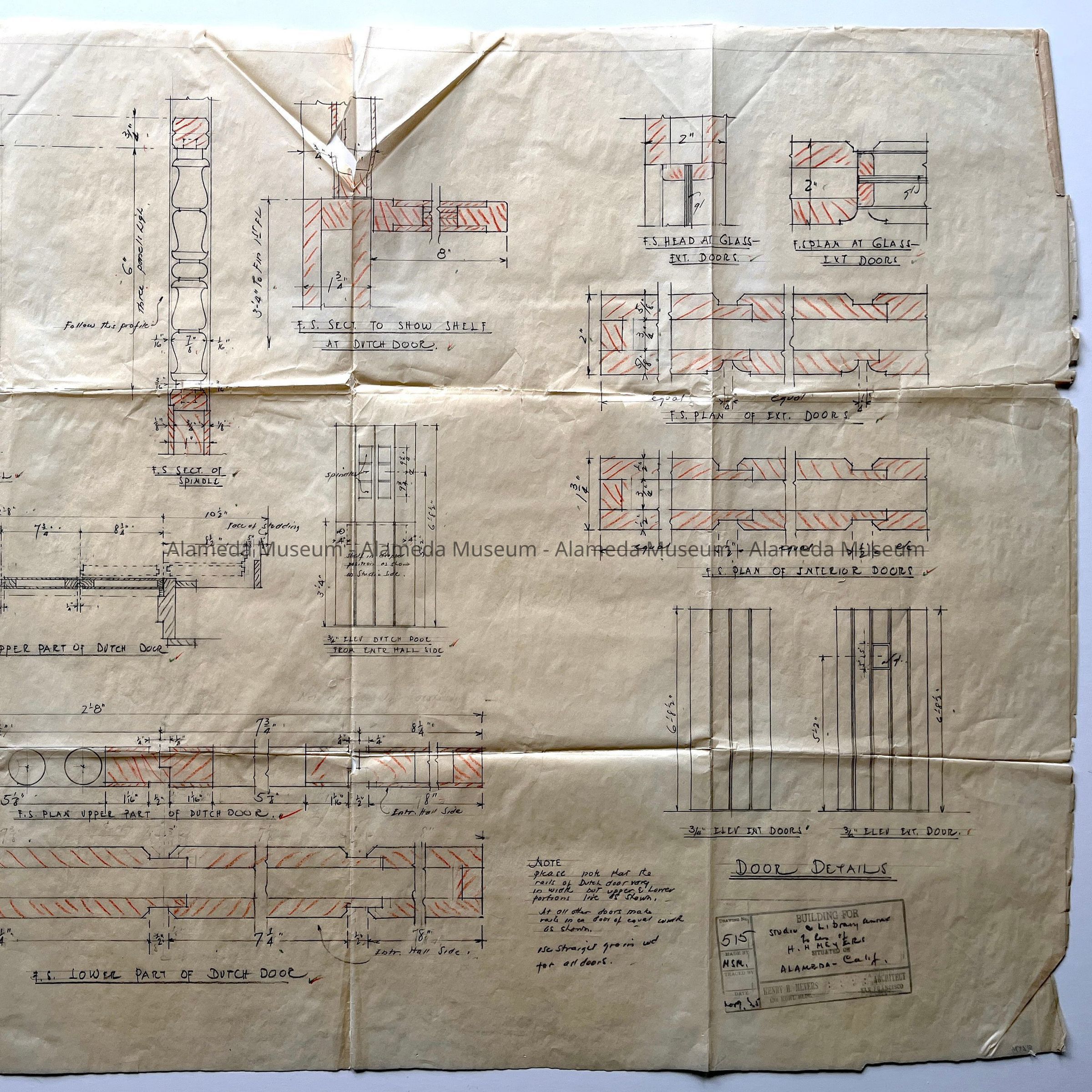 DRAWINGS DEPICTING DETAILS OF DOORS, STUDIO AND LIBRARY ANNEX TO THE HENRY H MEYERS' RESIDENCE. THE ANNEX WAS LOCATED AT 2024 CENTRAL AVENUE, ALAMEDA, CALIFORNIA. DRAWINGS WERE MADE BY MILDRED S MEYERS (ARCHITECT) ON NOVEMBER 9, 1935.