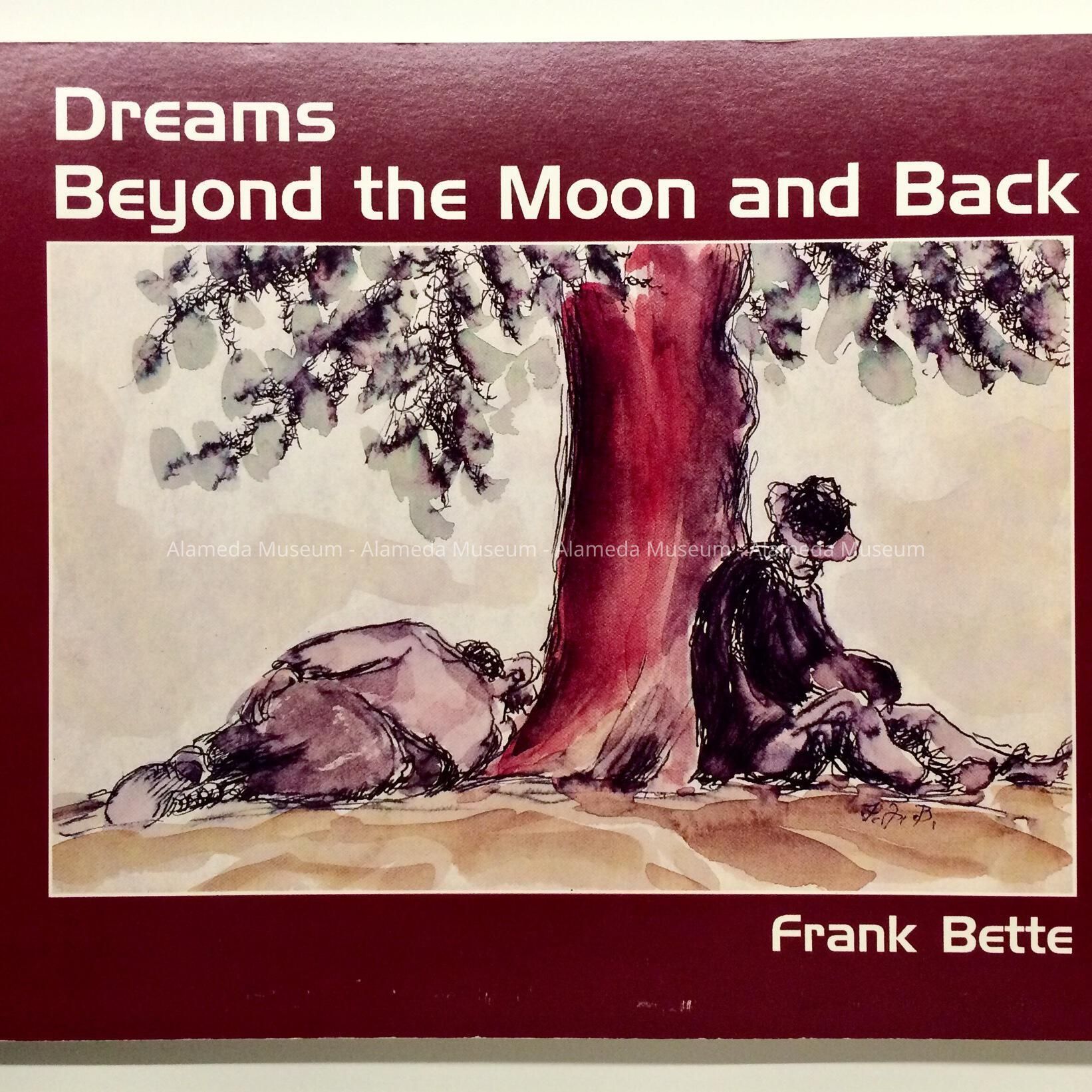 Description: soft-bound book with glossy maroon paper stock cover. Front cover has an ink-and-watercolor drawing of two men asleep under a pine tree, and white caption: "Dreams Beyond the Moon and Back", "Frank Bette". Back cover has what appears to be a marker drawing of a person on a carpet flying over a city. Typesetting and design: Falcon Books, Alameda.
