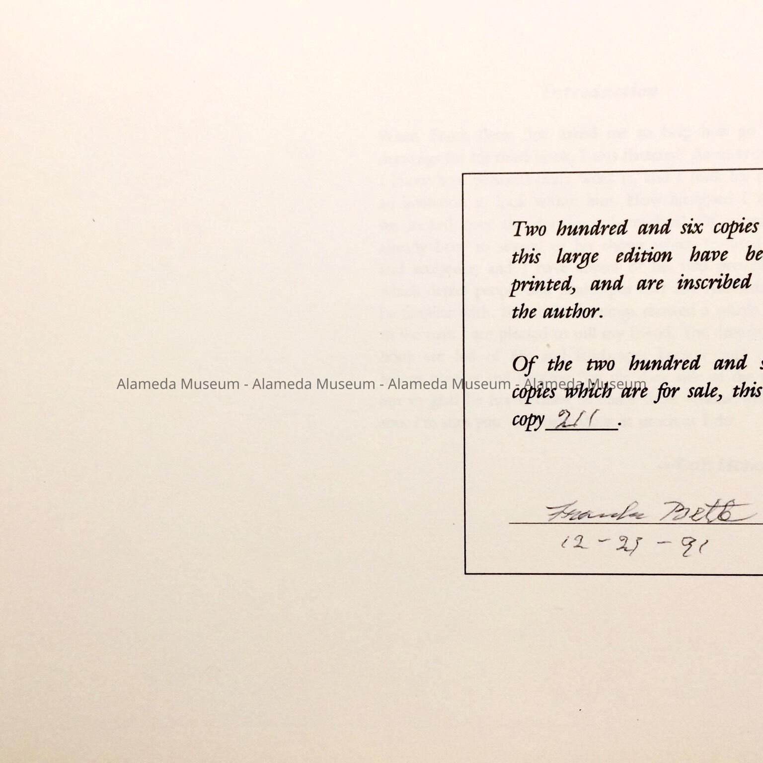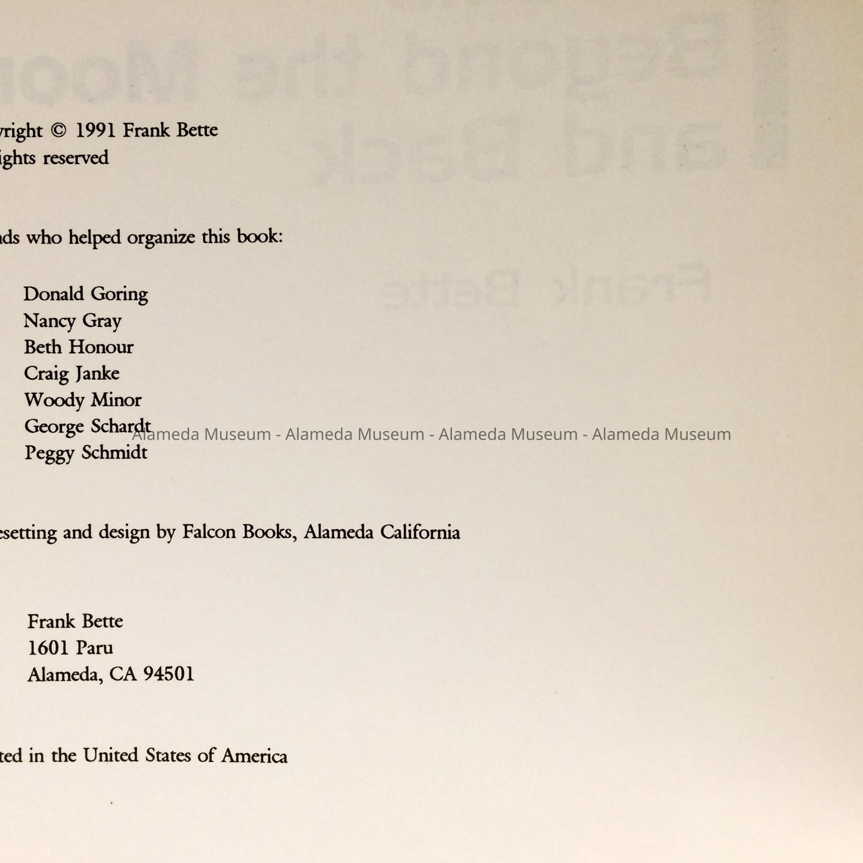 History: Book of poems and art work, mostly printed in black-and-white, by Frank Bette, longtime Alameda resident, artisan and artist, and founder of the Frank Bette Center for the arts. Copyrighted 1991, Frank Bette. According to handwritten number on fly leaf, copy 211 of 206 copies printed.[? Perhaps 201?].