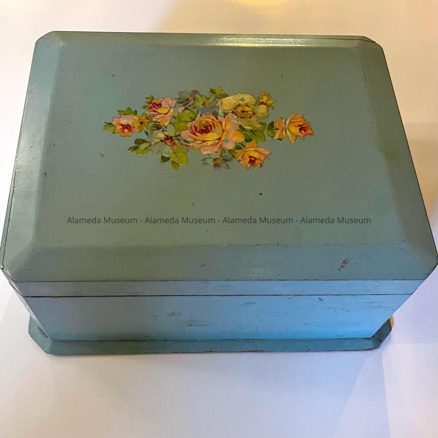 DESCRIPTION: A DRESSER OR MAKEUP BOX CONSTRUCTED OF WOOD WITH A HINGED LID. INTERIOR OF LID HAS A MIRROR WITH SILK CORDING AROUND THE EDGE. THE BOX WITH ITS ORIGINAL PAINTED FINISH OF BLUE ENAMEL, HAS A TRANSFER DESIGN ON THE LID IN MULTICOLORED ROSES.