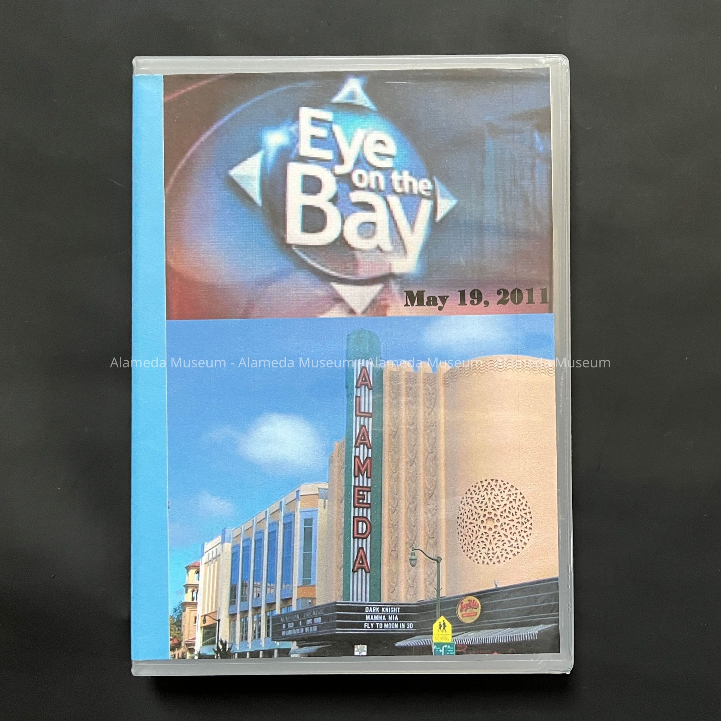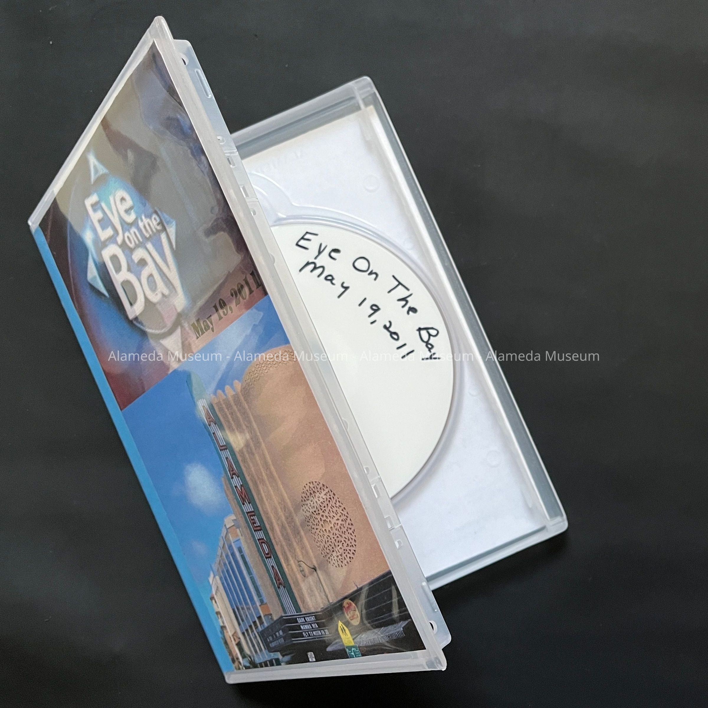 Description: a plastic disc, on one side white and transparent, other side metal prismatic, in transparent plastic casette, with paper cover insert showing a logo : ‘Eye on the Bay’, an image of the Alameda Theatre, and in black type: May 19, 2011. Back cover lists details about the movie. Disc has in black marker: ‘Eye on the Bay / May 19, 2011‘