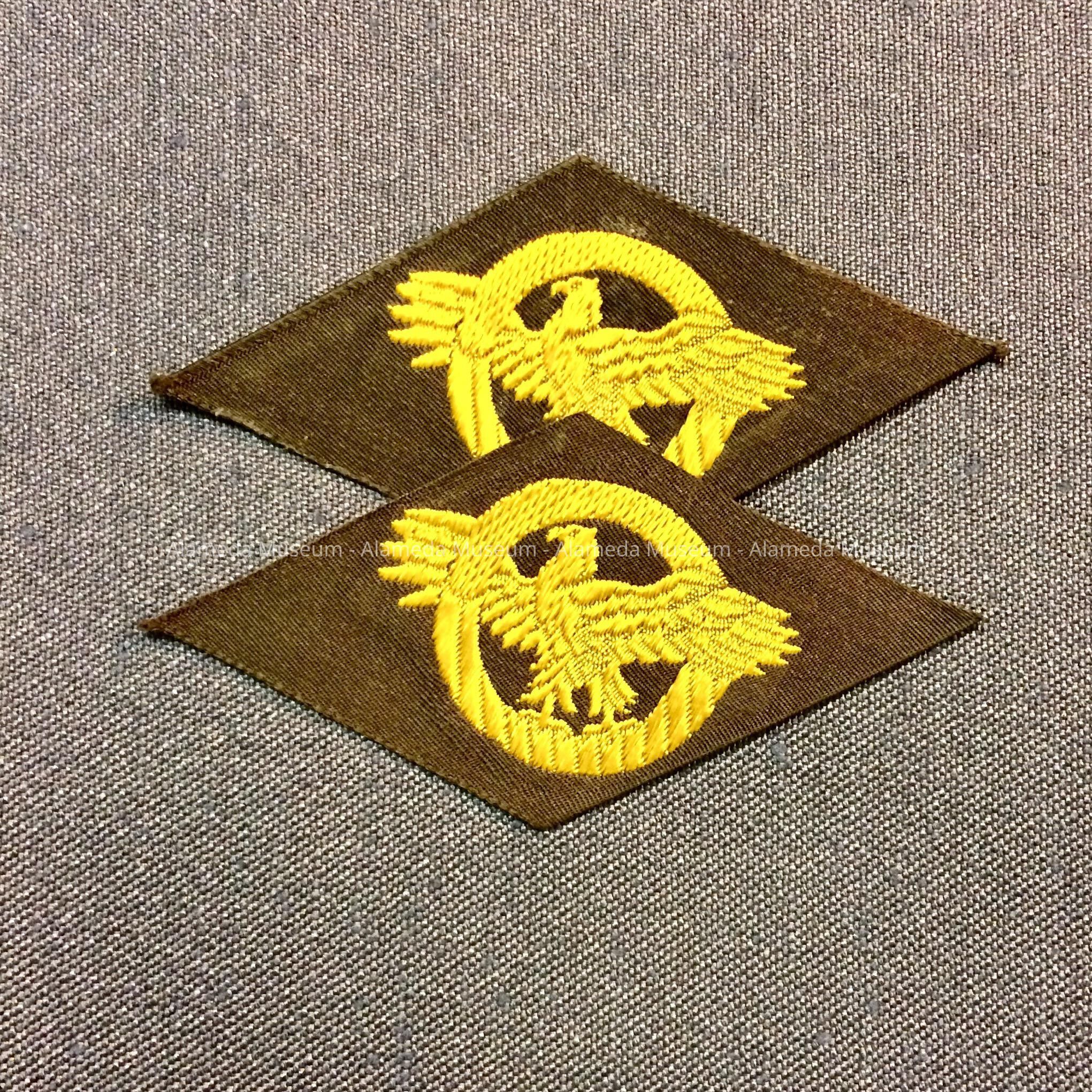 TWO IDENTICAL INSIGNIAS, CONSISTING OF GOLD-COLORED DESIGN FEATURING AN EAGLE WITHIN A CIRCLE ON A KHAKI GREEN-COLORED SILK BACKGROUND. INSIGNIA ON EMBLEMS ARE DIAMOND-SHAPED.