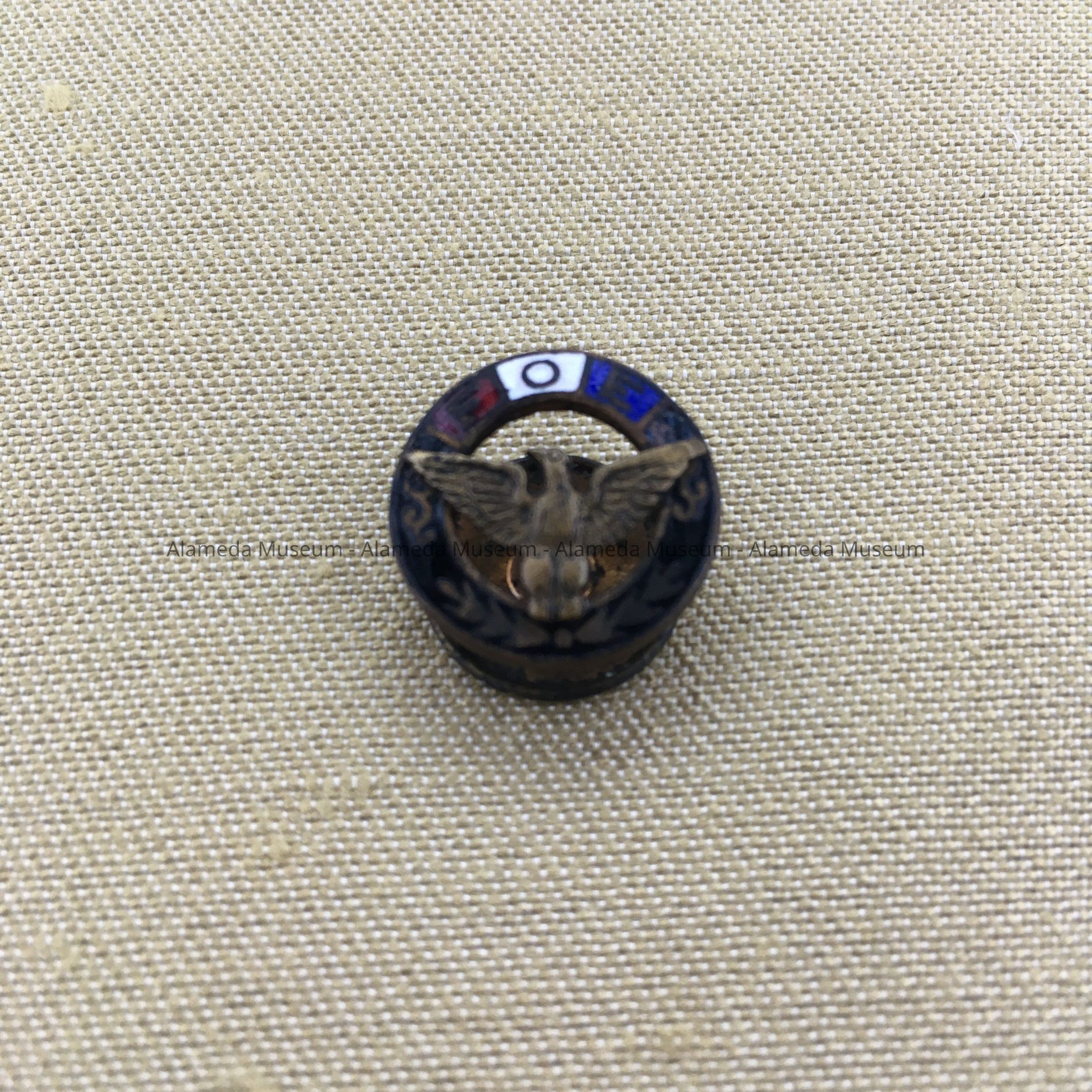 History of Objects: Eagle's fraternity pin, likely of W. C. Forsyth, stepfather of the donor. Forsyth came to live in Alameda at the age of 9. He joined the Alameda Aerie No. 1076, F. O. E. (Fraternal Order of Eagles) in 1909, and became its president for the 1910 term.