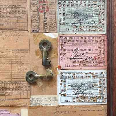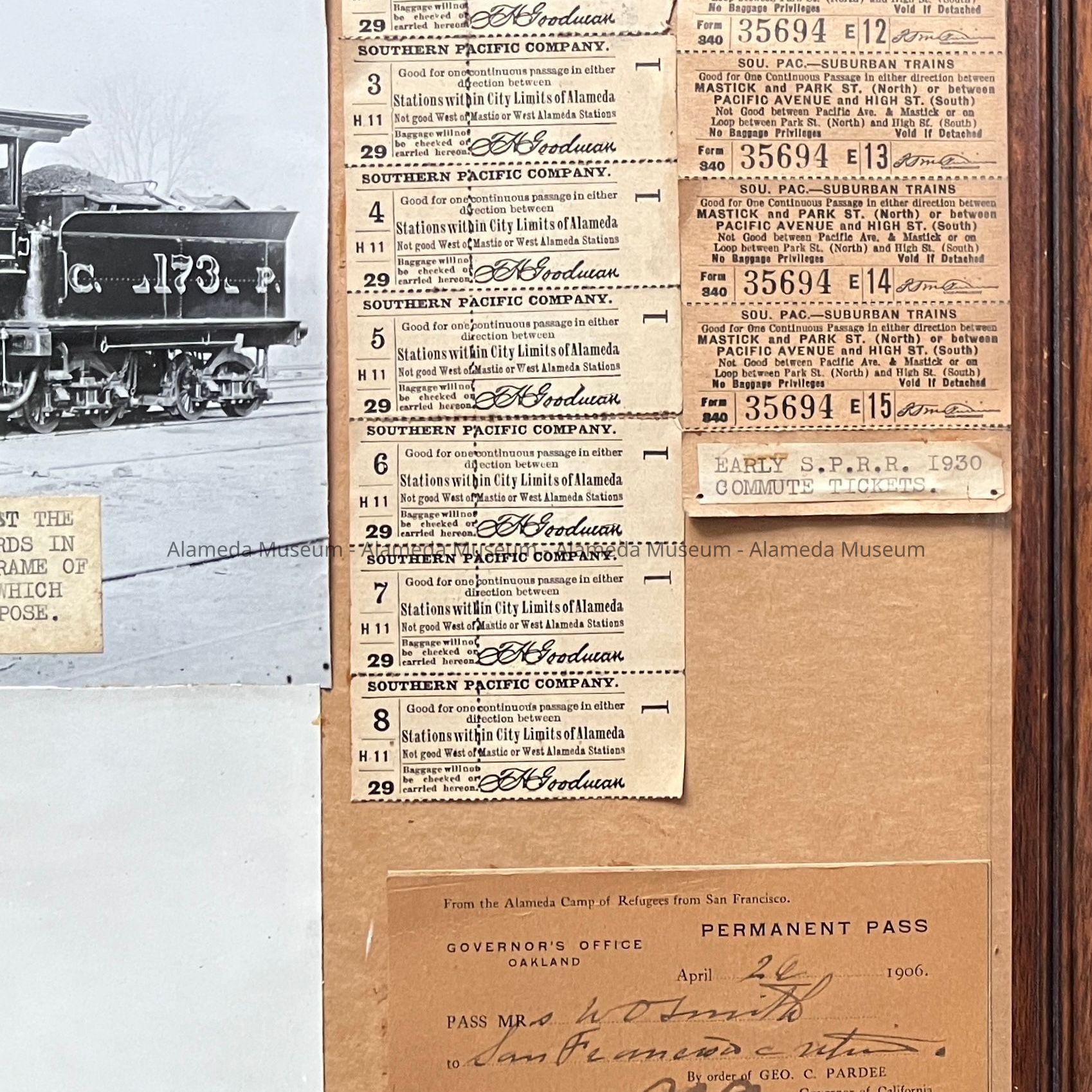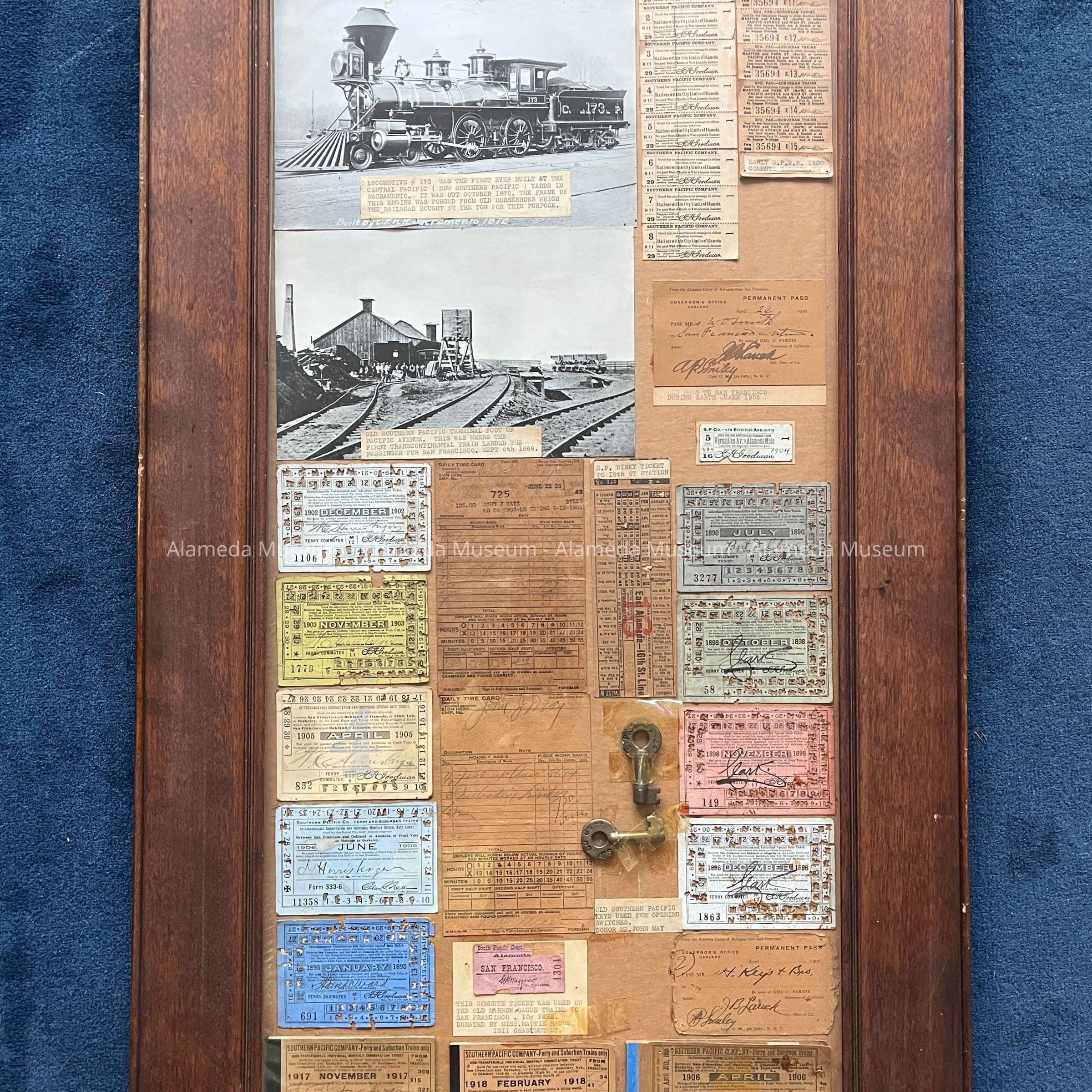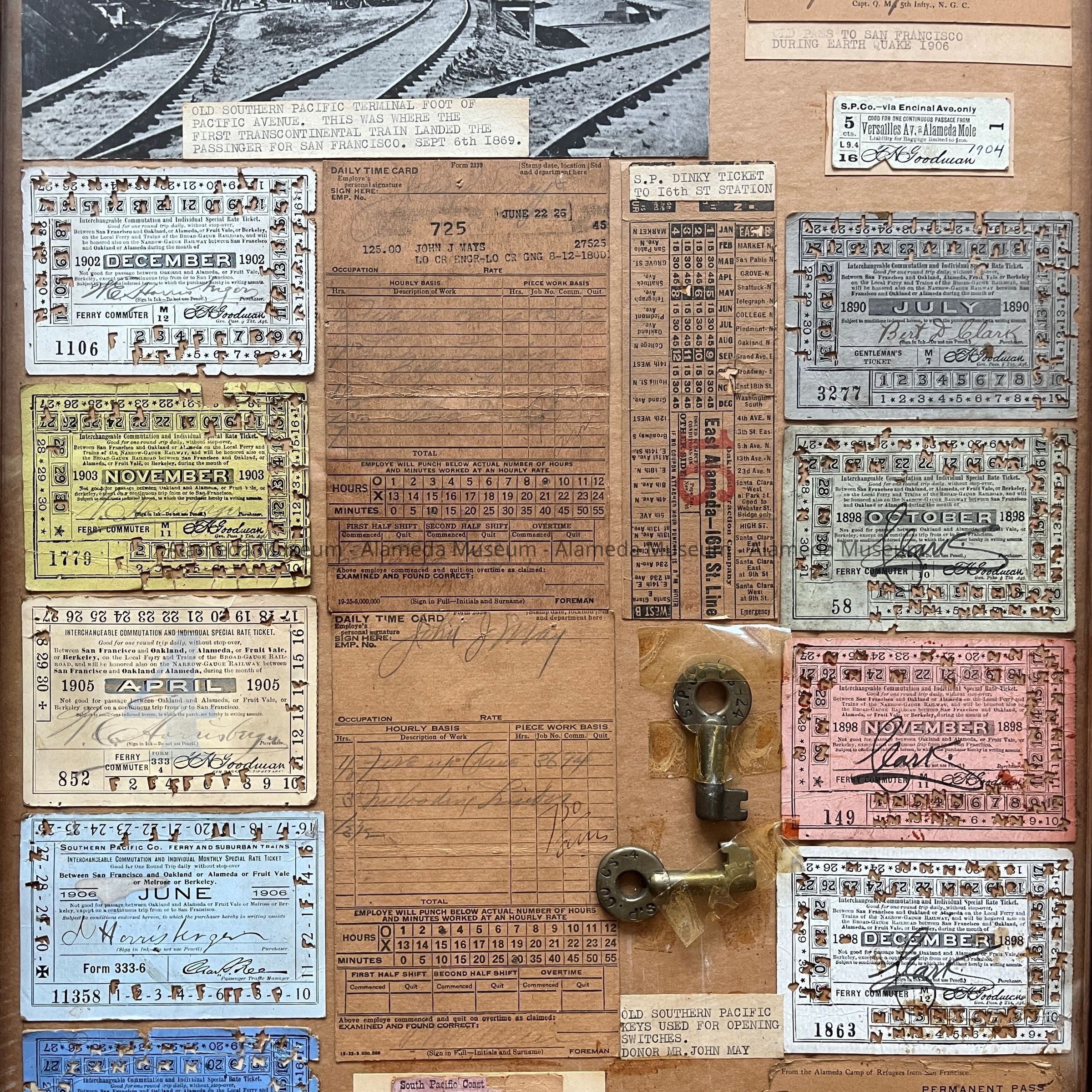 Description: A collection of objects dated between 1890 and 1906, except for one group from 1930 and photos of earlier scenes (one of the terminal on Pacific Ave of the San Francisco and Alameda Railway, one of a locomotive), with typed descriptive labels, in dark-stained oak frame. The objects include used or partially used transportation tickets and ticket booklets, marked S.P. Co. or Southern Pacific, 2 metal keys stamped 'S.P. Co. C.S', 2 photos, 2 Foreman's time card forms (one from 1925, one undated), and 2 passes dated 1906 labeled 'From the Alameda Camp of Refugees from San Francisco'.