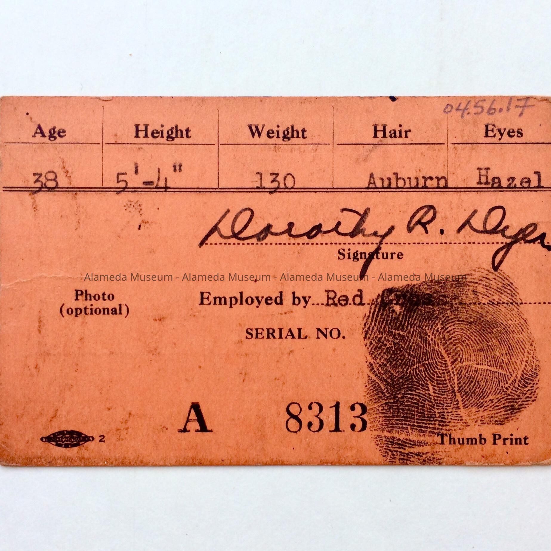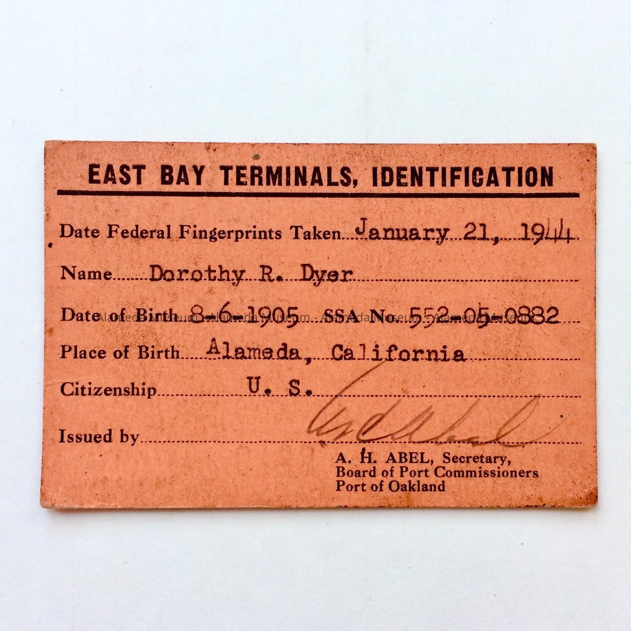AN ID PASS TO THE EAST BAY TERMINAL, ISSUED ON JANUARY 21, 1944, TO DOROTHY DYER. THE CARD INCLUDES A PHYSICAL DESCRIPTION AND HER FINGERPRINTS.