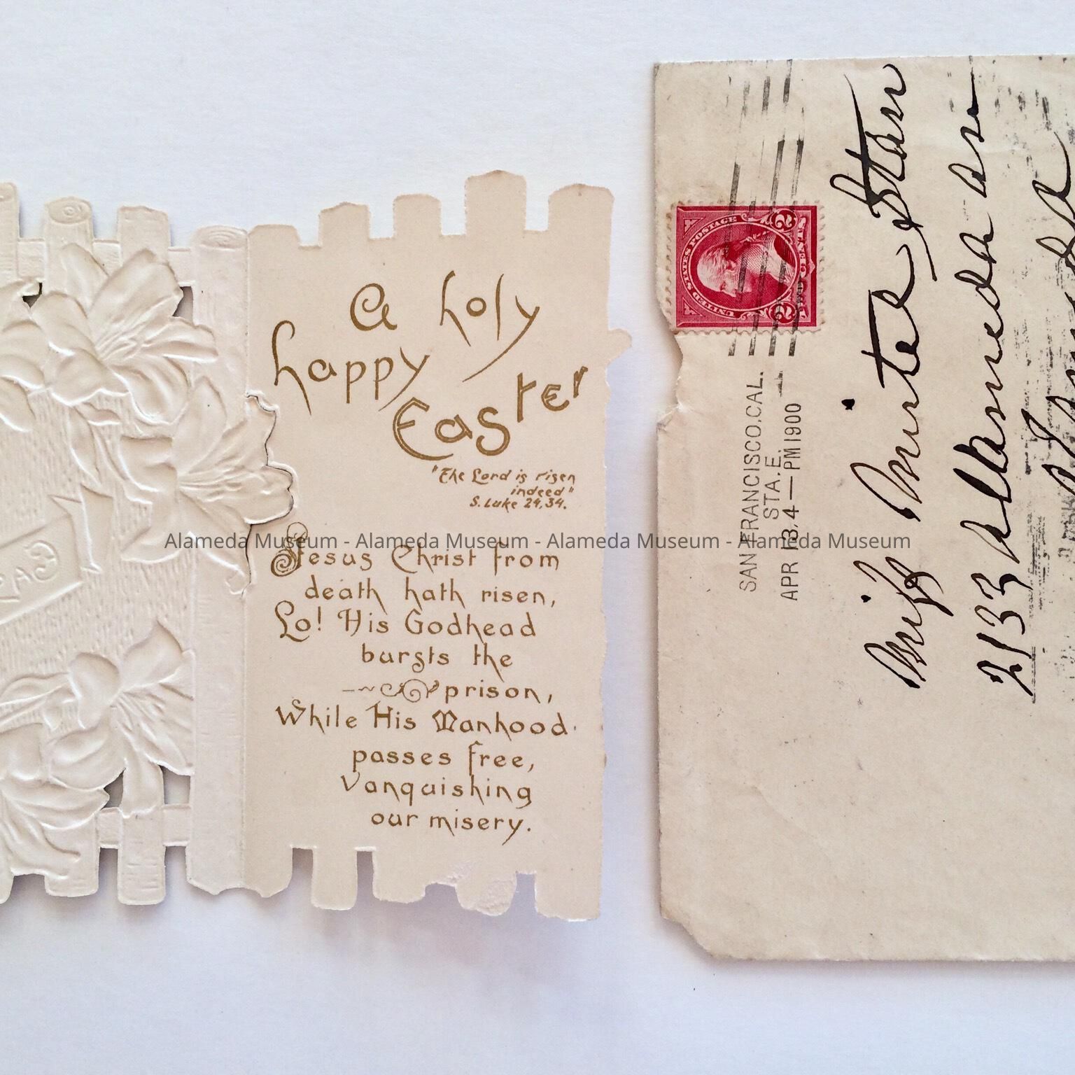 HISTORY OF OBJECT: EASTER CARD SENT TO MYRTLE RUTH, DAUGHTER OF MR. AND MRS. GEORGE A. STARR. THE FAMILY CAME TO ALAMEDA IN THE 1890's.