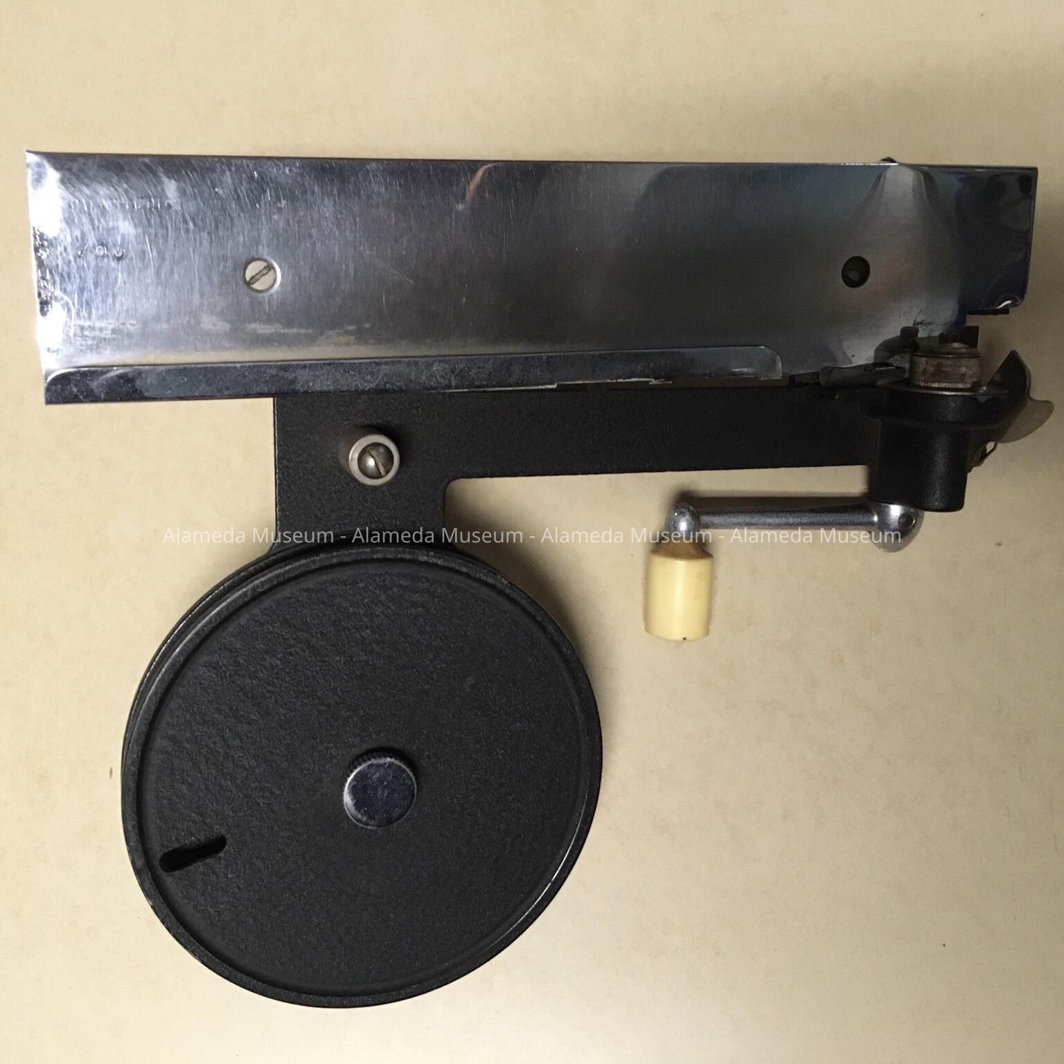 Edging implement used to apply a tape finish to the edge of drawings to protect from damage. It was originally used by the Public Works Department, Engineering Division, City of Alameda.