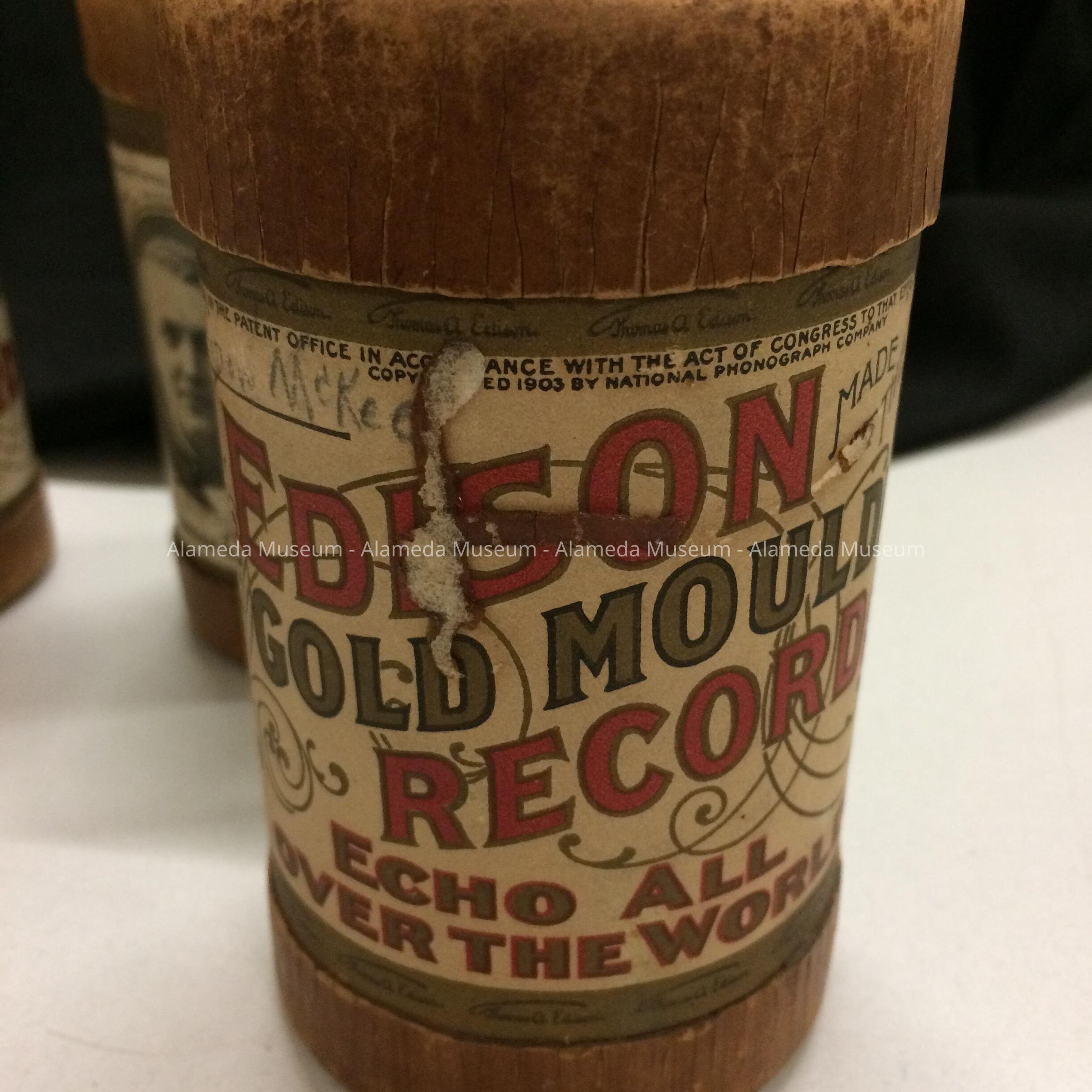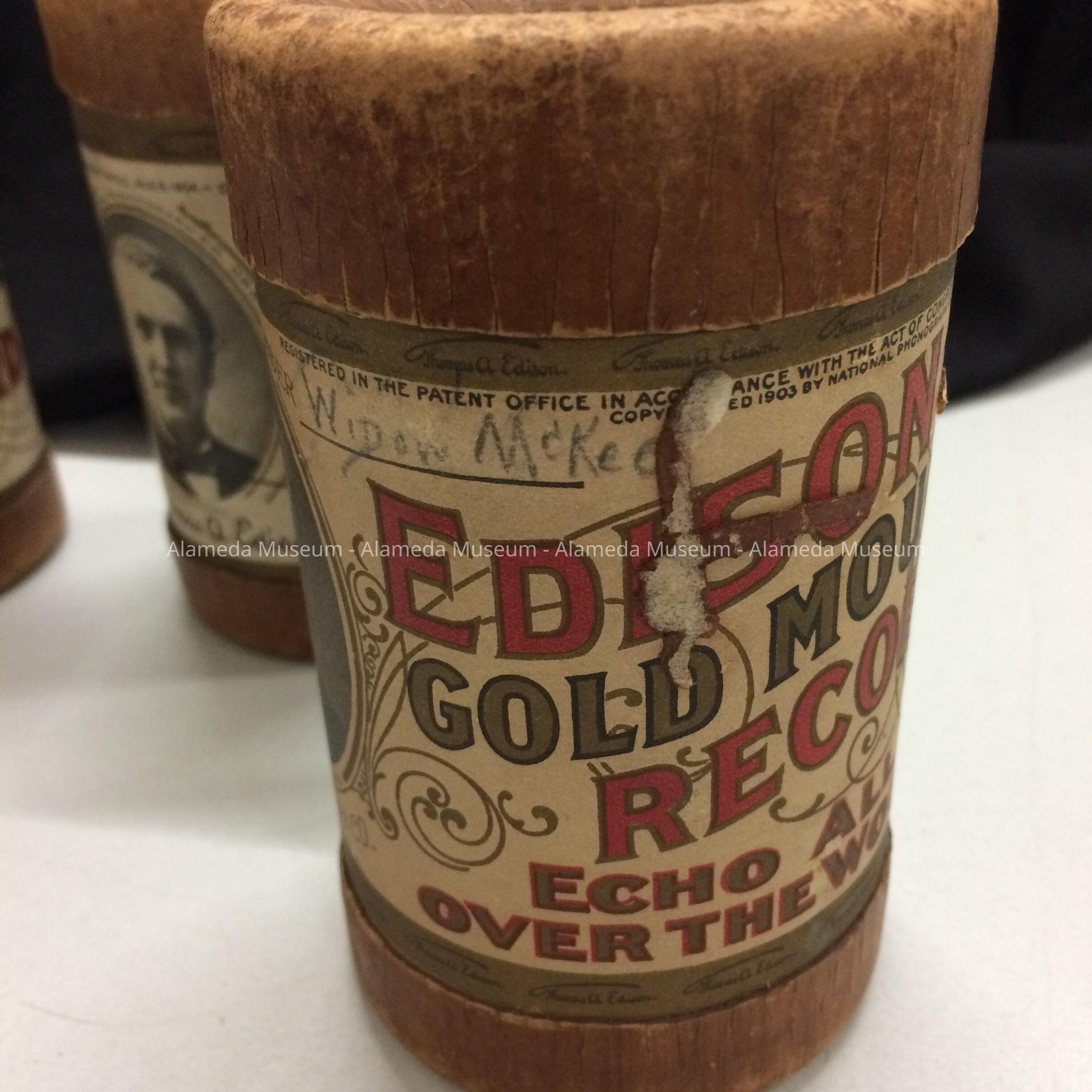 Description: Brown cylinder record entitled "Widow McKee" (written title in pencil on label of container). Record housed in cardboard container with paper label with bold printed caption "Edison Gold Moulded Records" & portrait of the inventor (Edison).