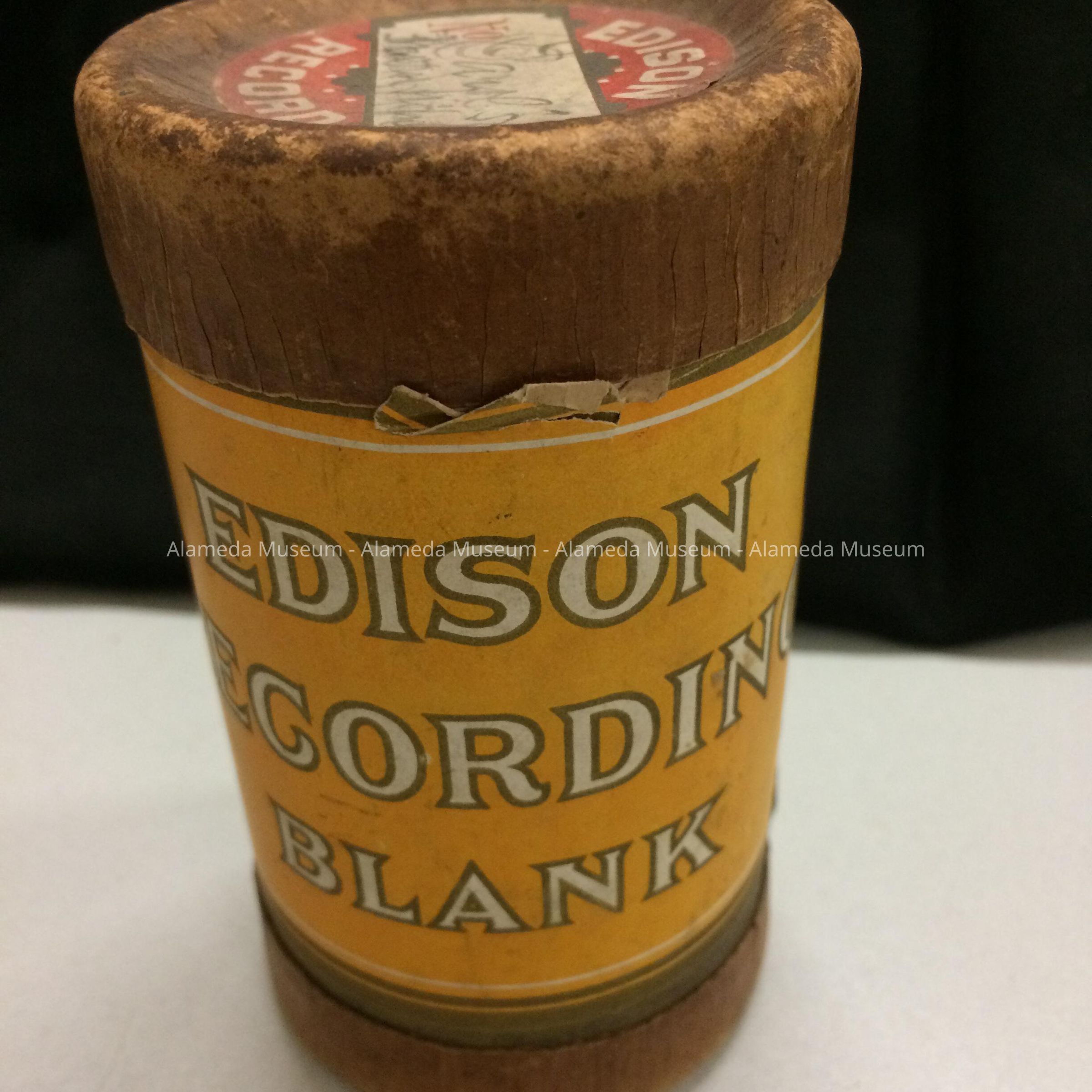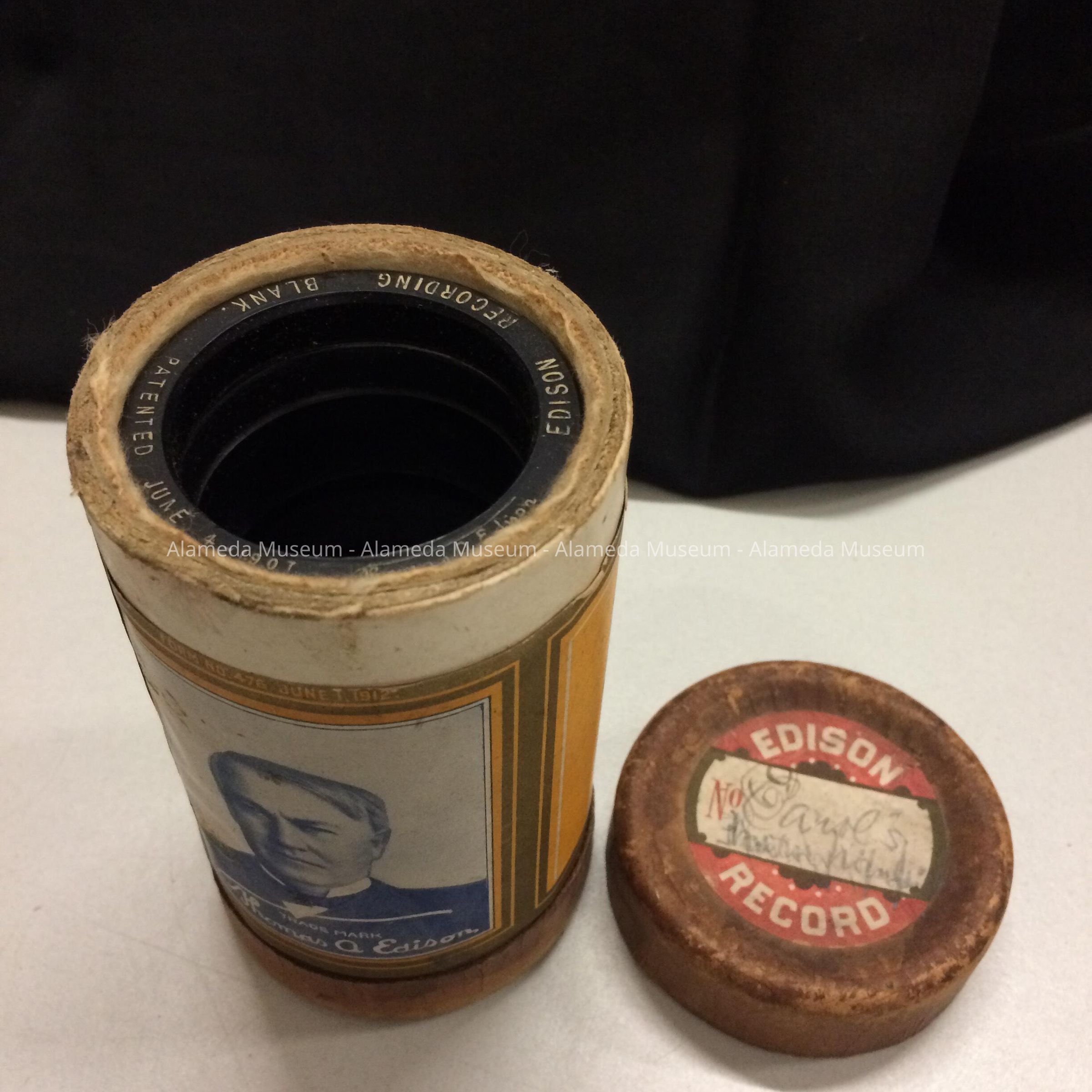 Description: Black cylinder record with incised white lettering on rim "Edison Recording Blank, Patented June 4, 1907 & Thomas A. Edison (facsimile of signature)." Record housed in original cardboard container with paper label with bold printed caption "Edison Recording Blank" & portrait of the inventor (Edison)