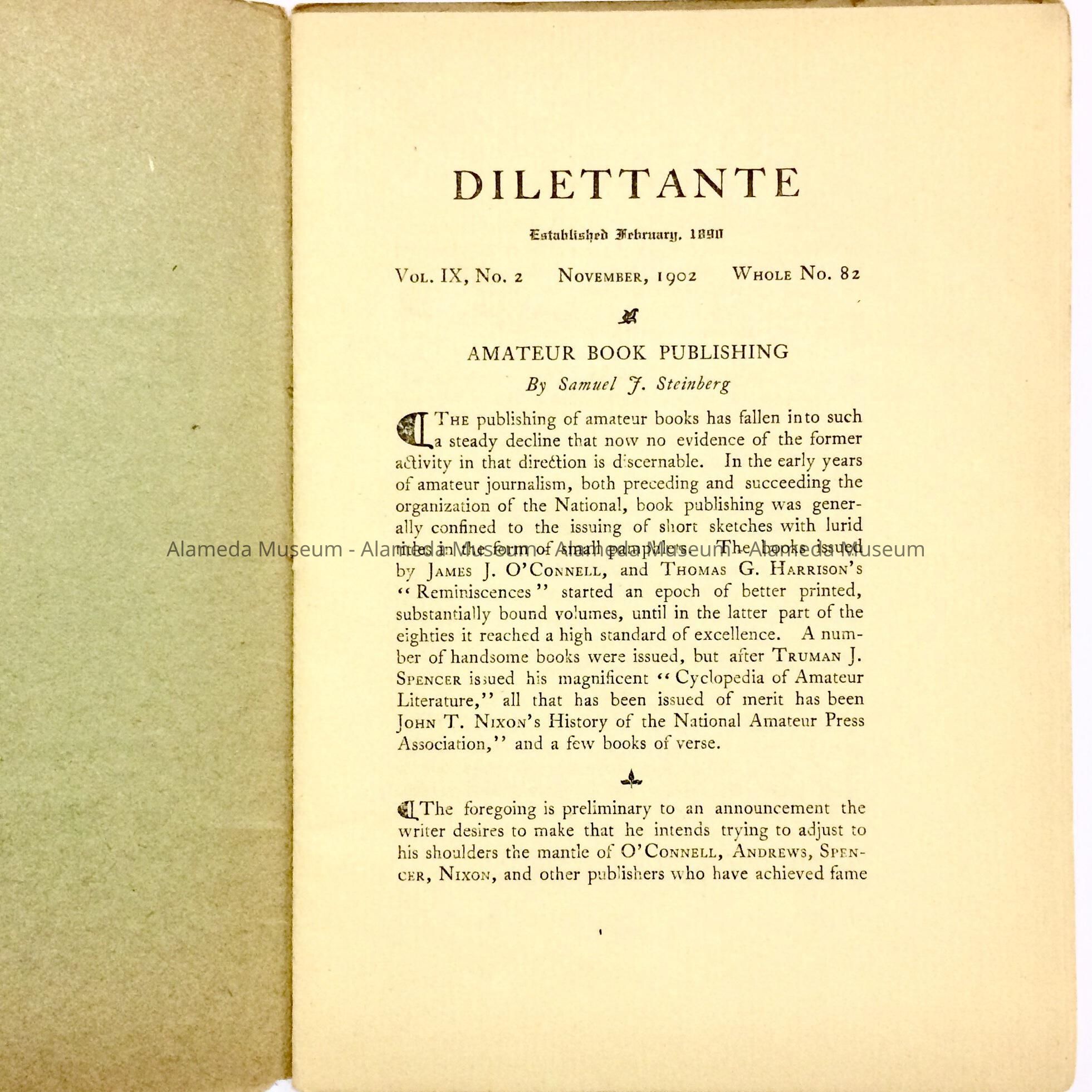 HISTORY OF OBJECT: A LITERARY PUBLICATION PUBLISHED IN 1902 BY SAMUEL J. STEINBERG, 1236 PARK STREET, ALAMEDA.
