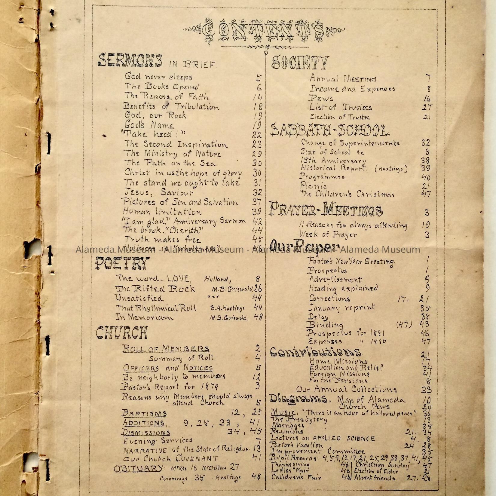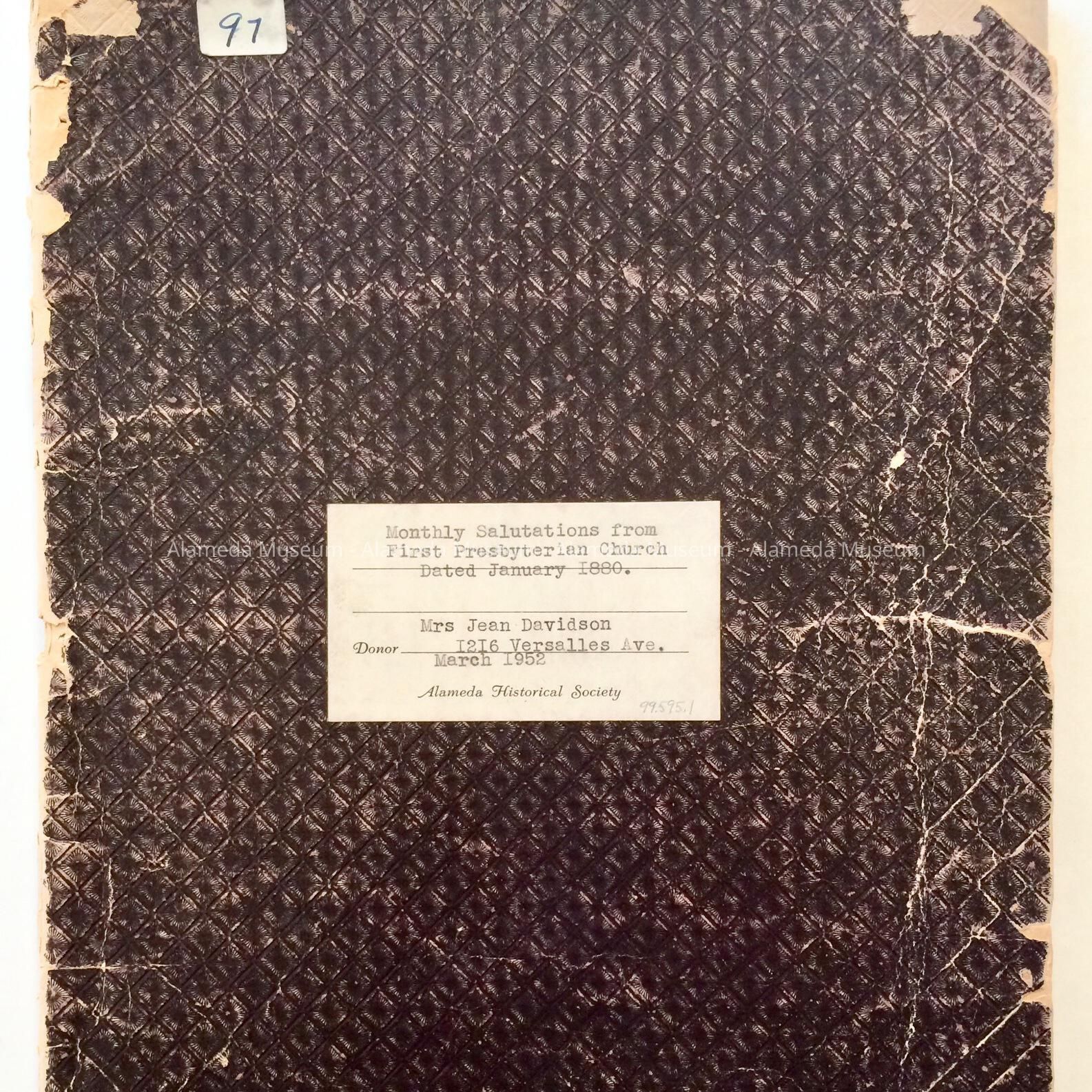 History: Publication entitled Salutations, a monthly pastorial letter of the Presbyterian Church from January to December 1880. In the May 1880 edition #5, a schematic of the Church pews are given with the locations and names of family pews. The March 1880 edition has a map of the City with the location of the homes of various parish members. The Church site was at the southwest corner of Central Avenue and Versailles Street. The location was abandoned in 1903 when the present Church was built at Santa Clara Avenue and Chestnut Street. Booklet given in March 1952 #97 and never catalogued.