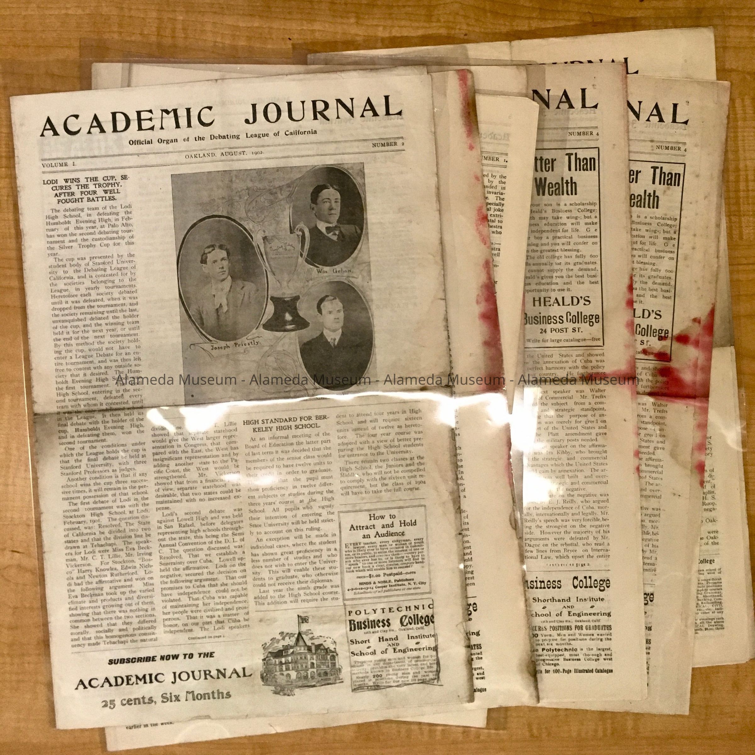 EDITIONS OF THE "ACADEMIC JOURNAL," CONTAINING ARTICLES REPRESENTING VARIOUS HIGH SCHOOLS IN THE STATE OF CALIFORNIA. PUBLISHED IN OAKLAND. ONE OF THE CONTRIBUTORS WAS DANIEL H KNOX, WHO REPRESENTED ALAMEDA HIGH SCHOOL. EACH VOLUME CONTAINS AN ARTICLE ON ALAMEDA HIGH SCHOOL.