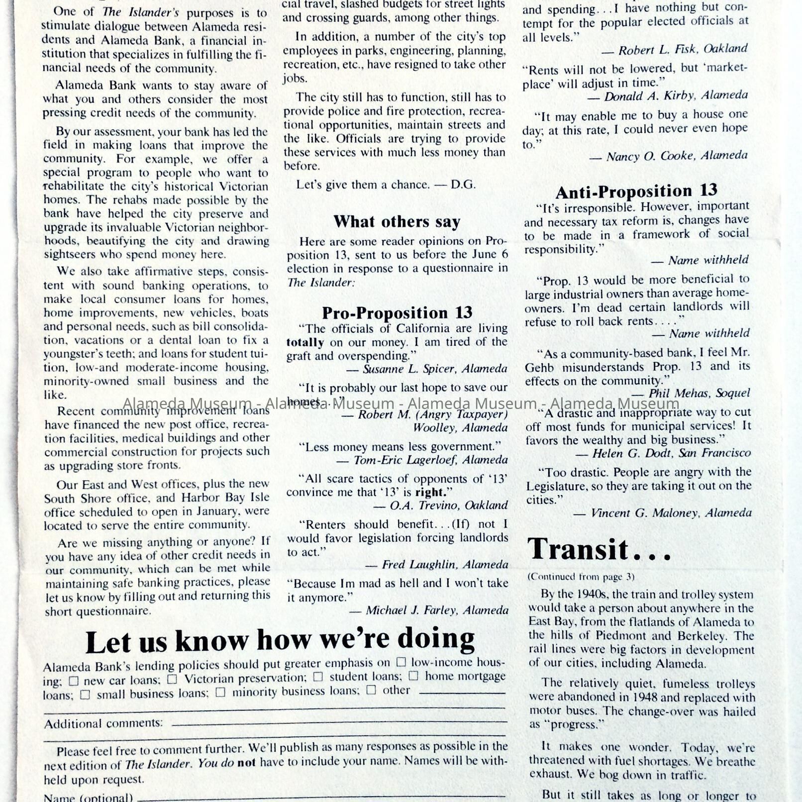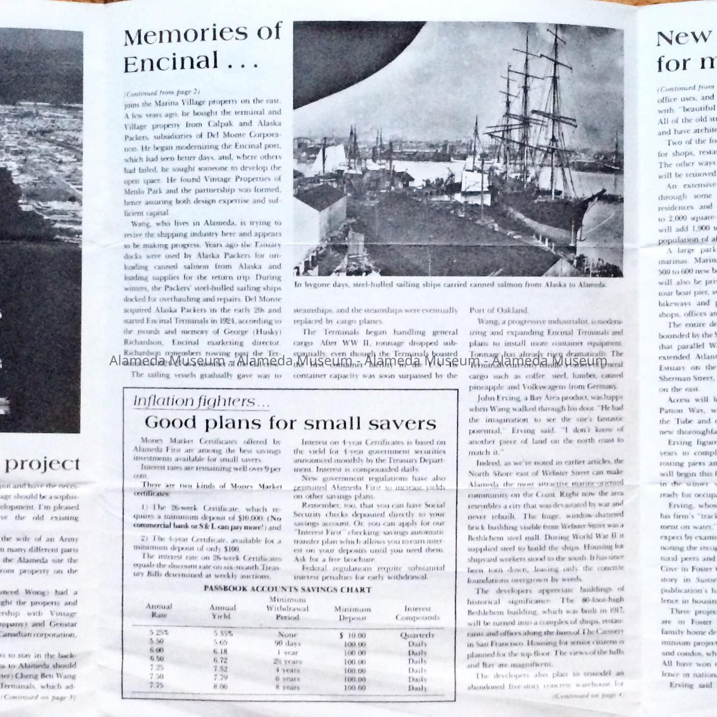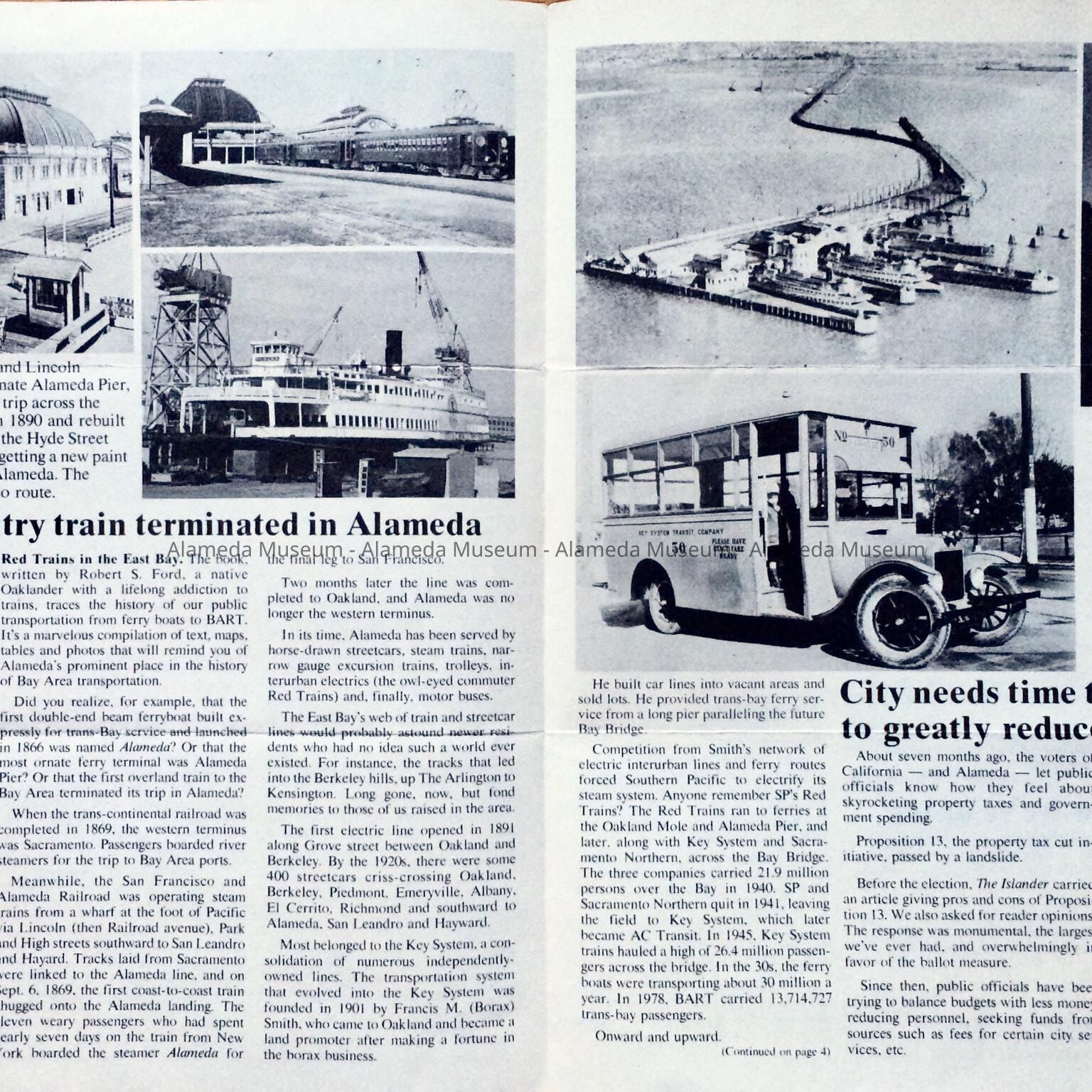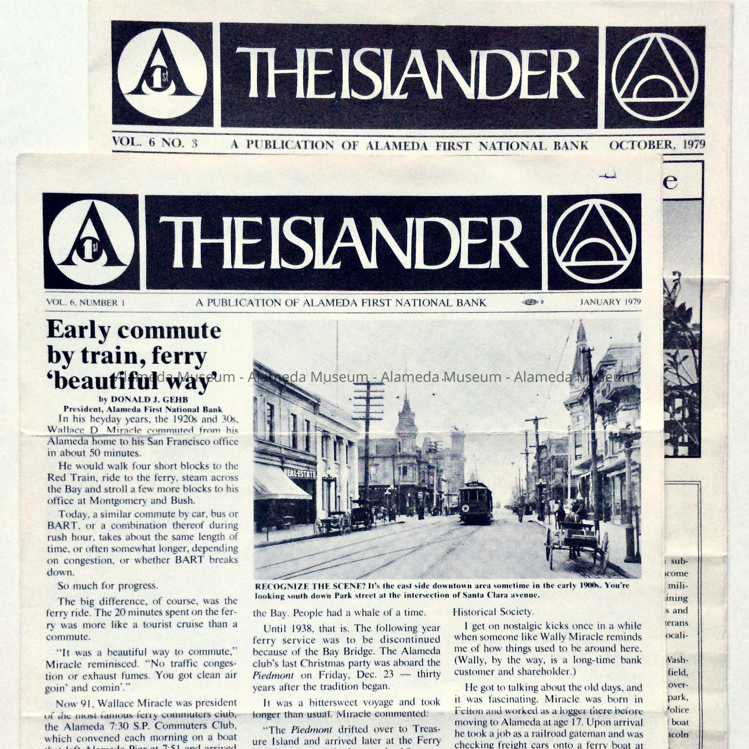PUBLICATIONS ENTITLED, "THE ISLANDER," ISSUED BY THE ALAMEDA FIRST NATIONAL BANK. THE JANUARY ISSUE INCLUDES AN ARTICLE ON THE EARLY COMMUTE BY TRAIN AND FERRY IN THE CITY. THE OCTOBER ISSUE HAS AN ARTICLE CONCERNING THE DEL MONTE PROPERTY AND ALASKA PACKERS.