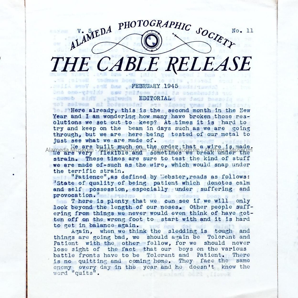 January, February and March 1945 editions of The Cable Release newsletter of the Alameda Photographic Society.
