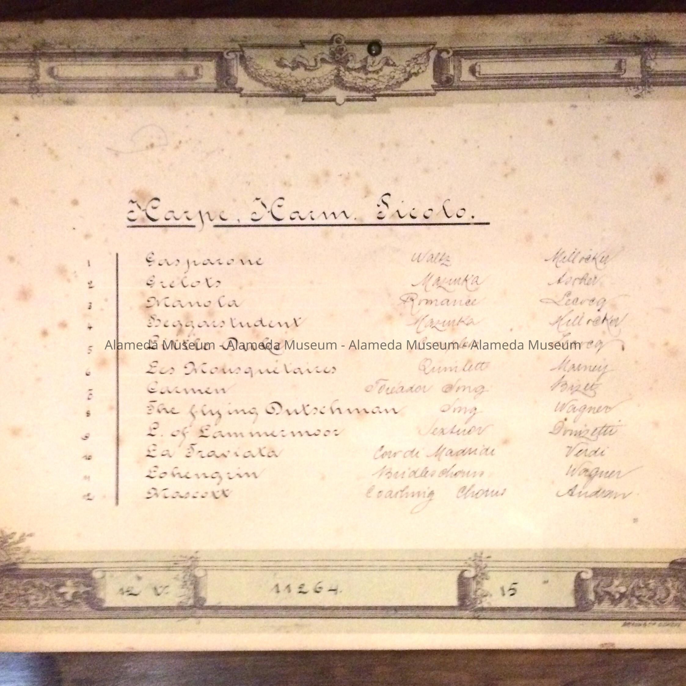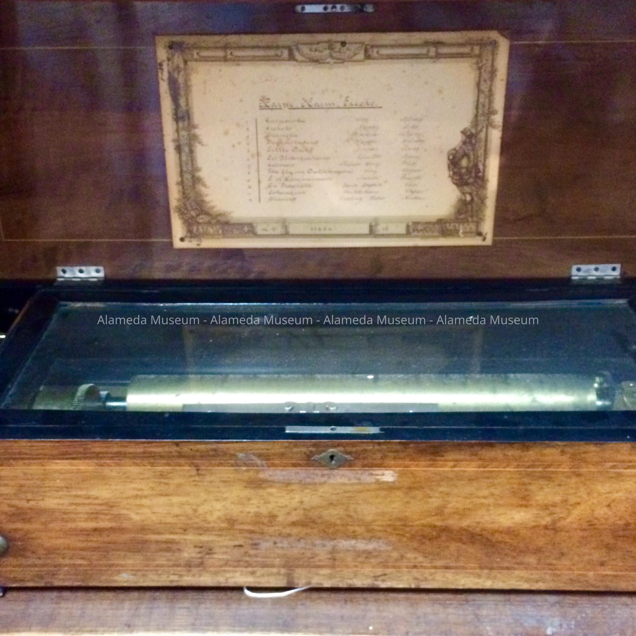 History of Object: This hundred year old music box was presented to the Alameda Historical Society by Mrs. Edmond Heritage, in memory of her late husband, Edmond Heritage. He lived in Alameda for many years and established one of the first nickelodeons (Oak Theater in Alameda, located on Santa Clara Avenue, near Park Street).