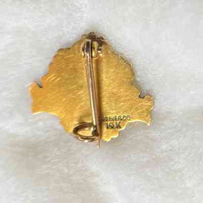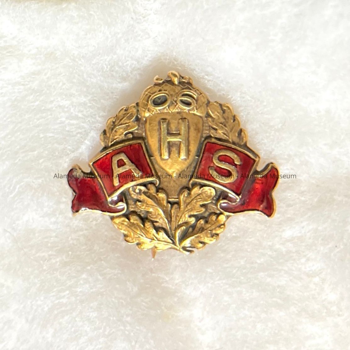 Description: a 14 kt. gold pin in the shape of a shield held between laurel branches with a ribbons of red translucent glass enamel to either side. The shield has the letter H, the ribbons A and S. Above the shield are the digits 06. Back has stamped ‘Shreve & Co’ and ‘14 KT’.