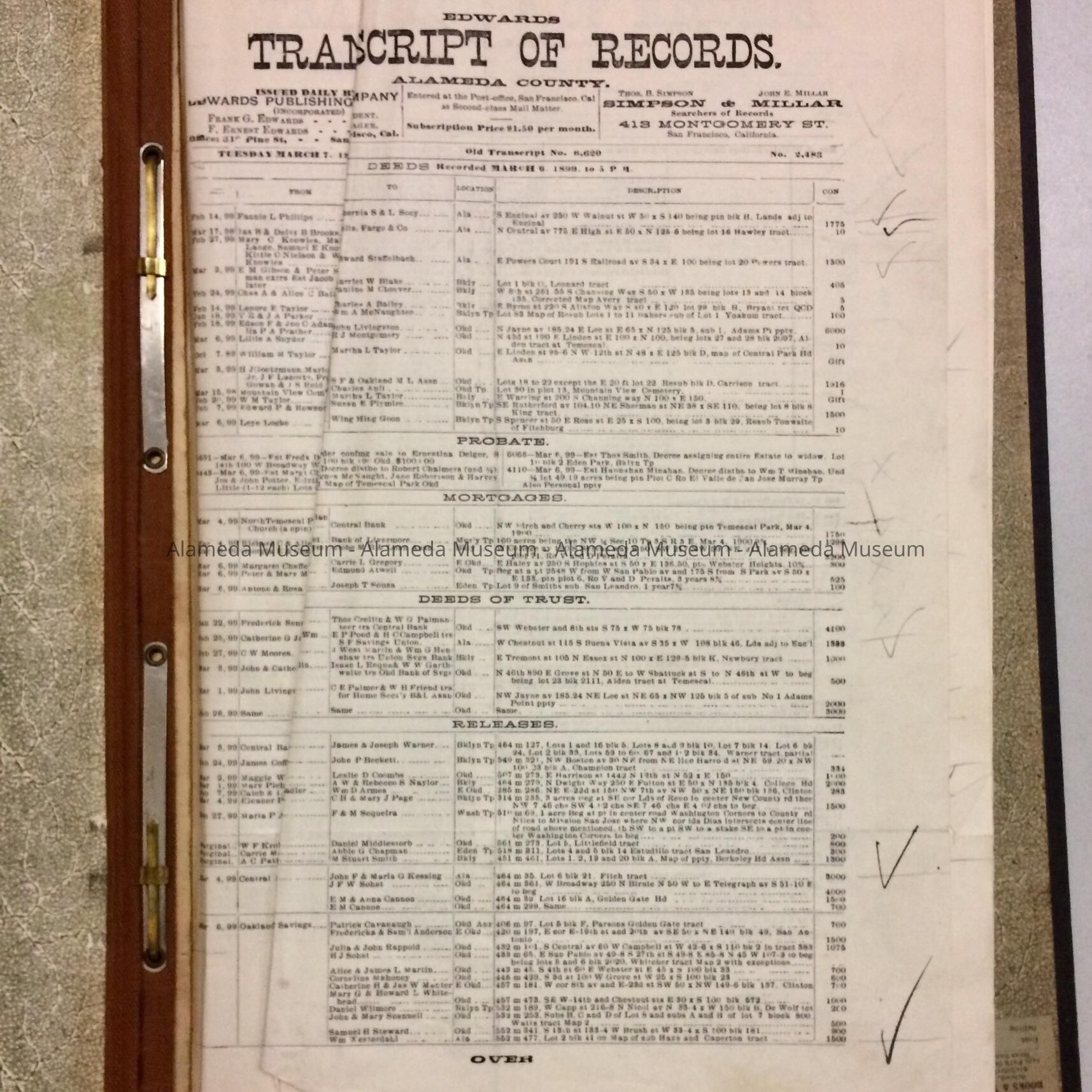 LOOSE-LEAF BINDER, CONTAINING EDWARDS TRANSCRIPTS OF TITLES FROM MARCH 8, 1898 THROUGH MARCH 6, 1899. RECORDS INCLUDE RECORDING OF DEEDS, MORTGAGES, DEEDS OF TRUST, RELEASES AND RECONVEYANCES, AND MISCELLANEOUS PAPERS (INCLUDING BUILDER'S CONTRACTS). BINDERS WERE ORIGINALLY PROPERTY OF THE CITY OF ALAMEDA ASSESSOR'S OFFICE, AND WERE FOUND IN THE ATTIC OF ALAMEDA CITY HALL. PRESENTED TO ALAMEDA HISTORICAL MUSEUM. DOCUMENTS ANNOTATED NAMES OF OWNERS, CONTRACTORS, AND OCCASIONALLY ARCHITECTS, AS WELL AS LEGAL DESCRIPTIONS OF STRUCTURES BUILT IN ALAMEDA. PUBLICATION ISSUED DAILY BY FRANK G EDWARDS, PRESIDENT, EDWARDS PUBLISHING COMPANY, INC., SAN FRANCISCO.