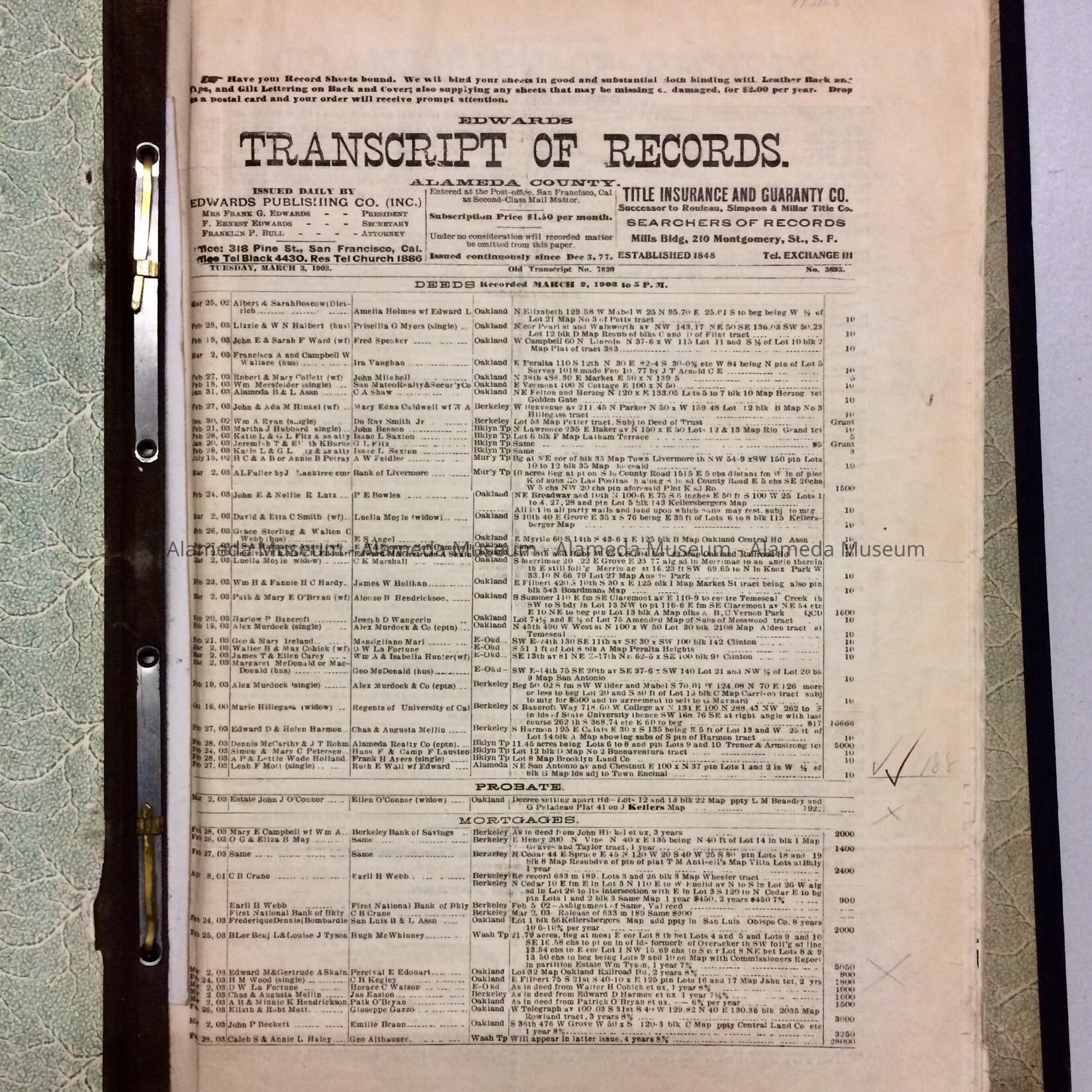 LOOSE-LEAF BINDER CONTAINING EDWARDS TRANSCRIPT OF TITLE, FROM MARCH 5, 1902 TO MARCH 3, 1903. HANDWRITTEN PAPER LABEL READS, "1902."