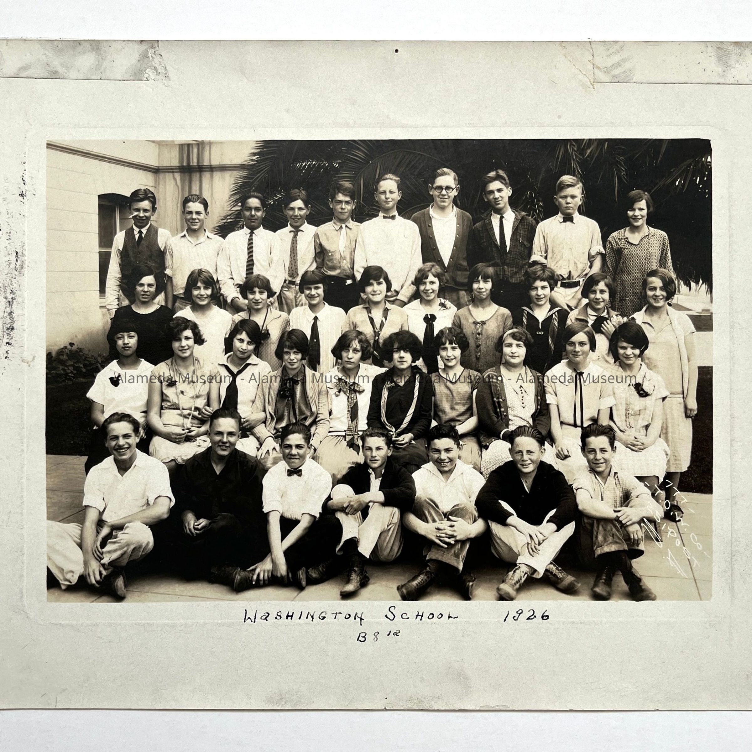 Description: Unmounted sepia-tinted photograph with handwritten caption "Washington School 1926". Reverse side has a roster of students' names.