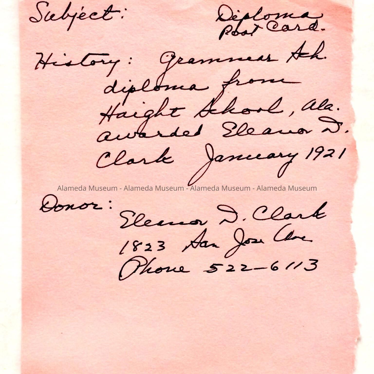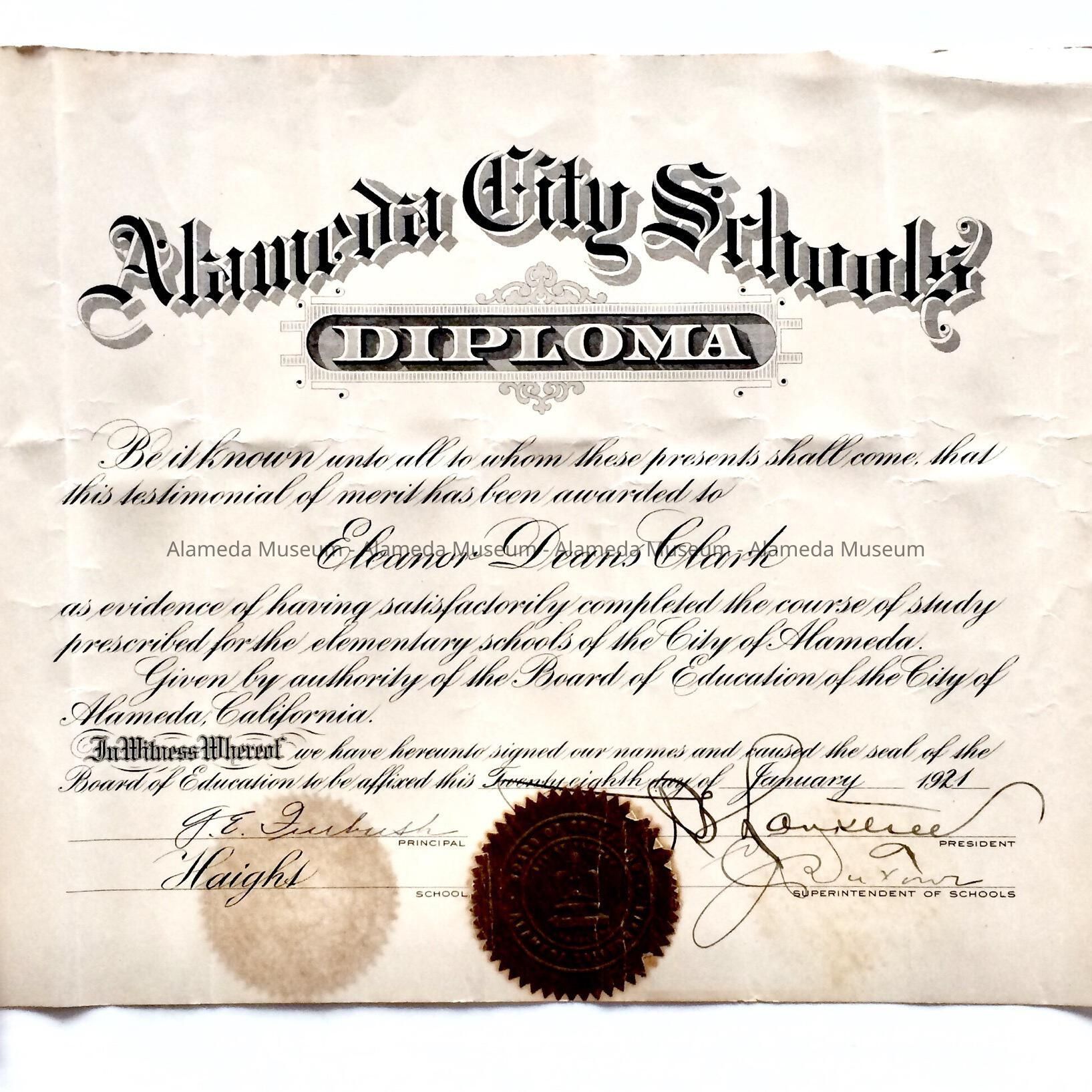 History of Object: Grammar school diploma from Haight School, Alameda, awarded to Eleanor D. Clark, January 1921.