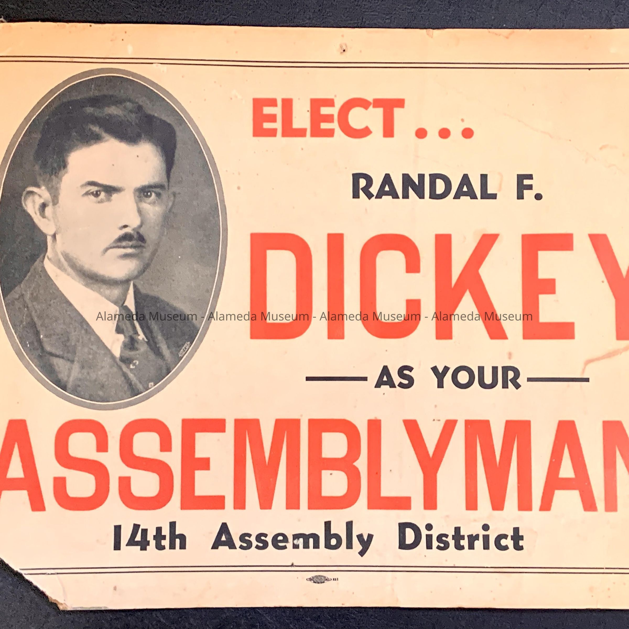 HISTORY OF OBJECT: AN ELECTION POSTER WITH A PORTRAIT AND AD FOR RANDALL F. DICKEY, RUNNING FOR ASSEMBLYMAN IN THE FOURTEENTH ASSEMBLY DISTRICT. MR. DICKEY WAS AN ATTORNEY AND MAINTAINED AN OFFICE AT 2329 SANTA CLARA AVENUE. HE RESIDED AT 3221 THOMPSON AVENUE, ALAMEDA. INFORMATION OBTAINED FROM THE POLK'S 1939 CITY DIRECTORY.