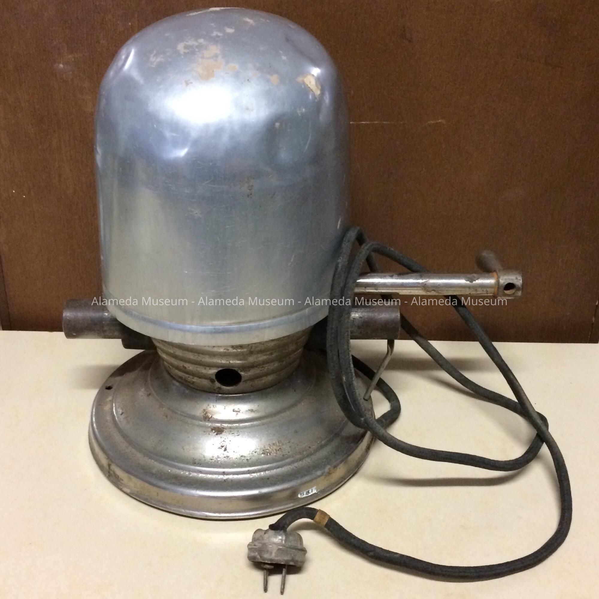 Description: Electric stretcher and hat steaming device consisting of a circular nickel plated base with aluminum crown and removable dome. Below the dome, when turned, an oblong handle enlarges the hat form.