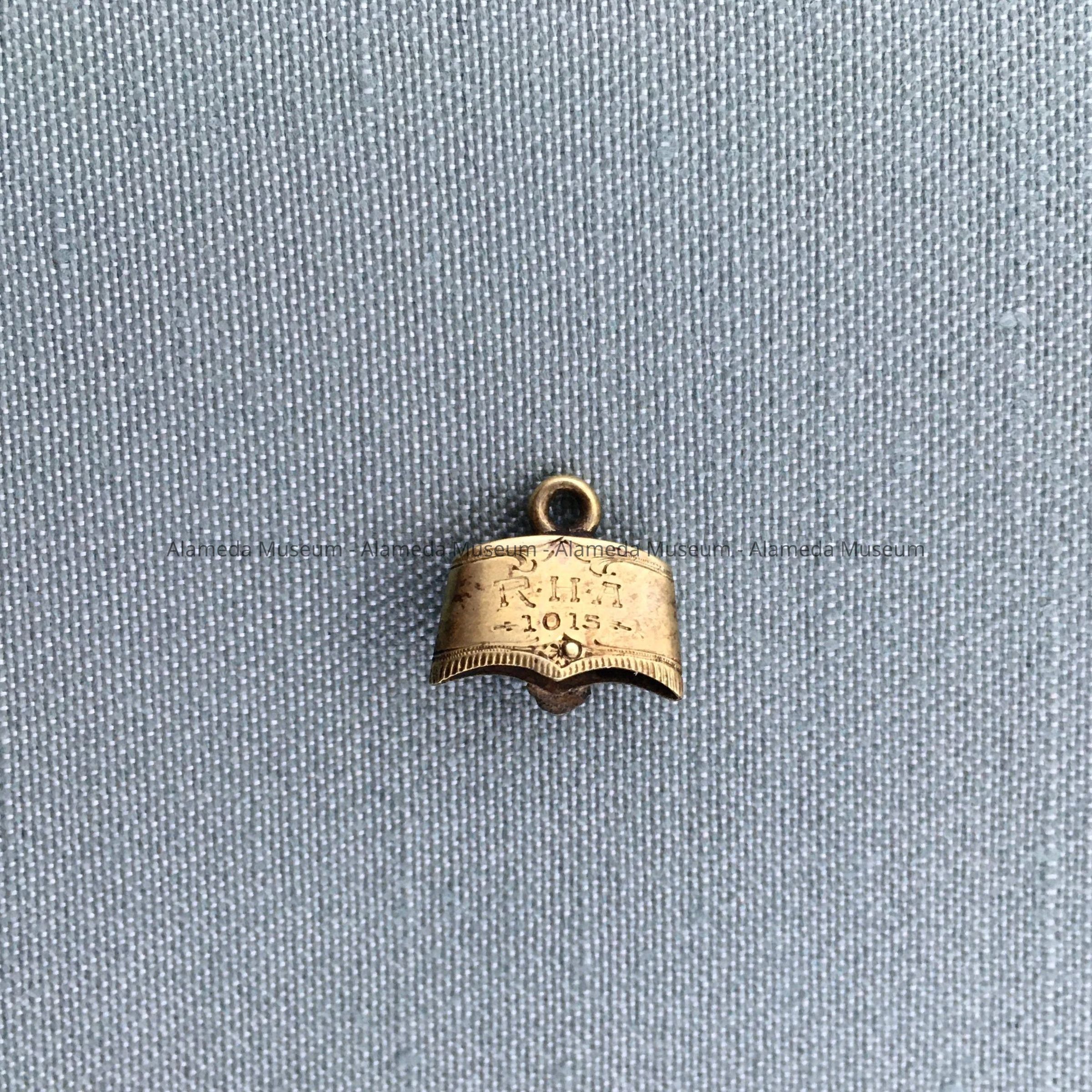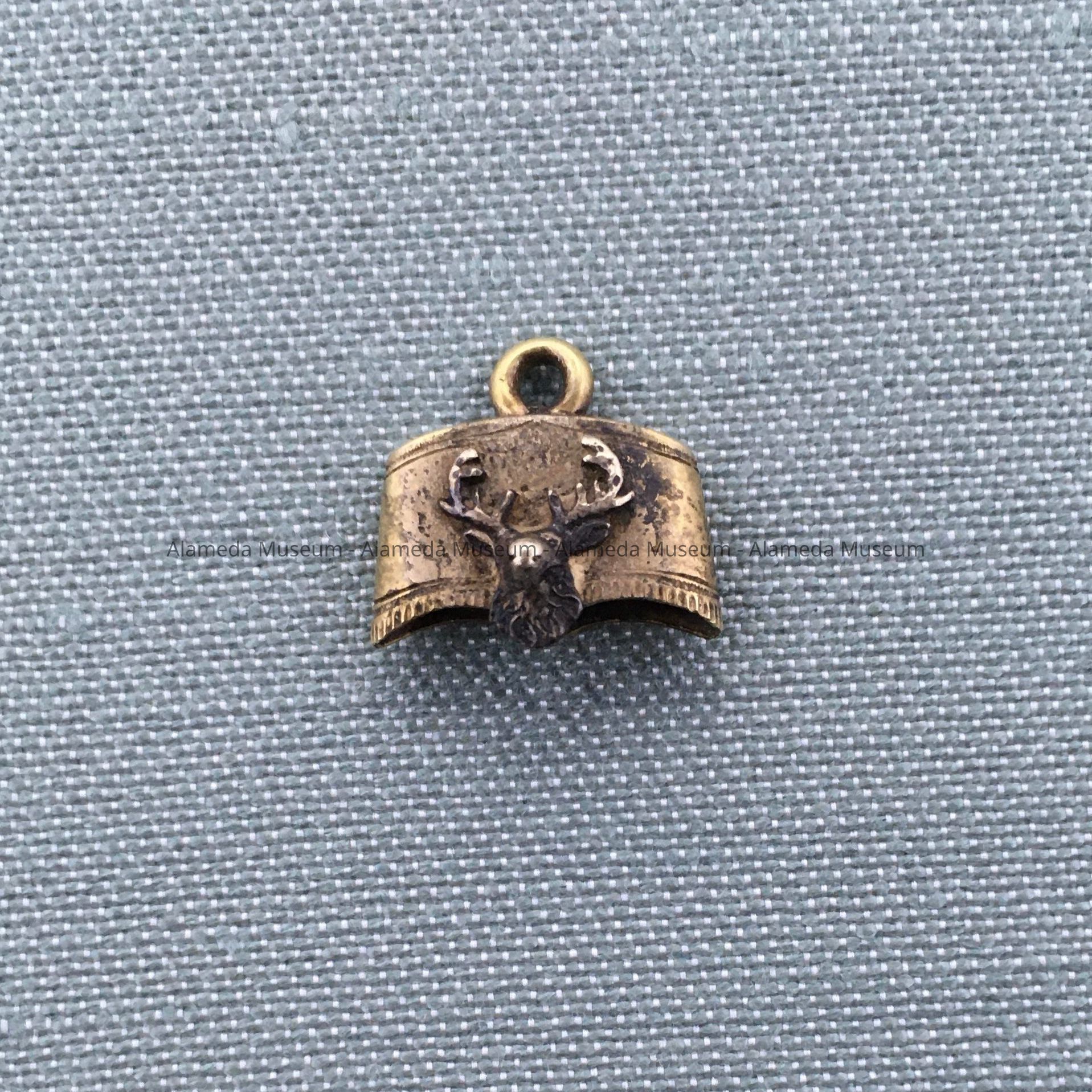 Description: gold pendant or charm with a ring at the top, in the shape of an oblong cap that is open at one end with 2 scallops, and has an embossed head of an elk on one side, and the letters R.H.A. and number 1015 engraved on the other side. A tiny pin protrudes from the back halfway into the cavity. No maker's mark.