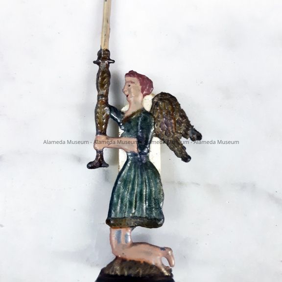 A FIGURINE MADE OF EMBOSSED LEAD DEPICTING A KNEELING ANGEL HOLDING A CANDLE STICK. FIGURINE IS COLD PAINTED IN SEVERAL COLORS.