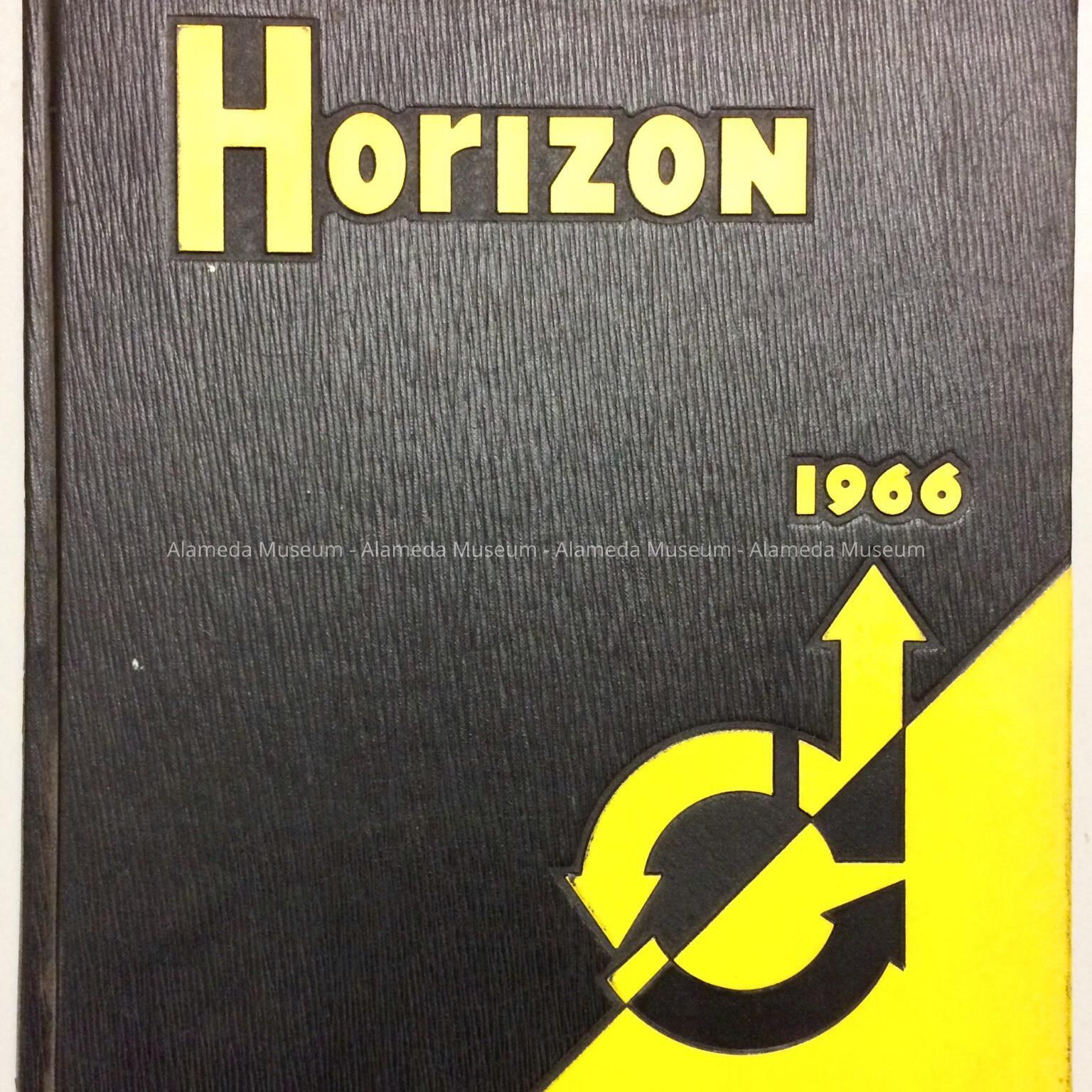 Hard-bound yearbook, with cover of imitation black-and-yellow colored plastic, with embossed caption ‘Horizon’ and ‘1966’ in yellow-colored type.