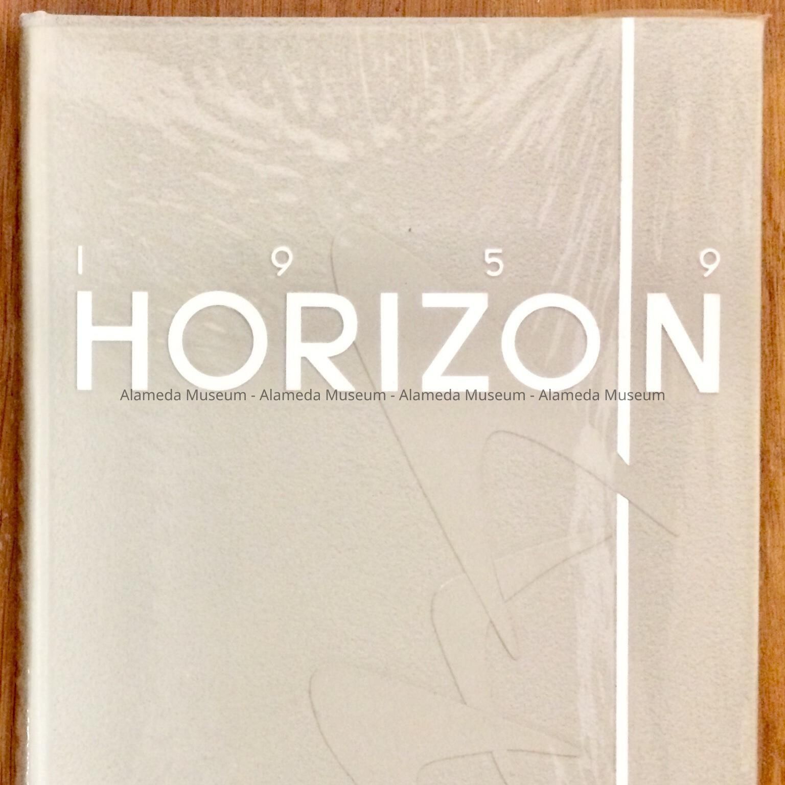 DESCRIPTION: A HARDBOUND ILLUSTRATED YEARBOOK WITH AN EMBOSSED MODERN DESIGN ON A GREY PLASTIC BACKGROUND. COVER HAS THE CAPTION, "HORIZON 1959" IN WHITE TYPE.
