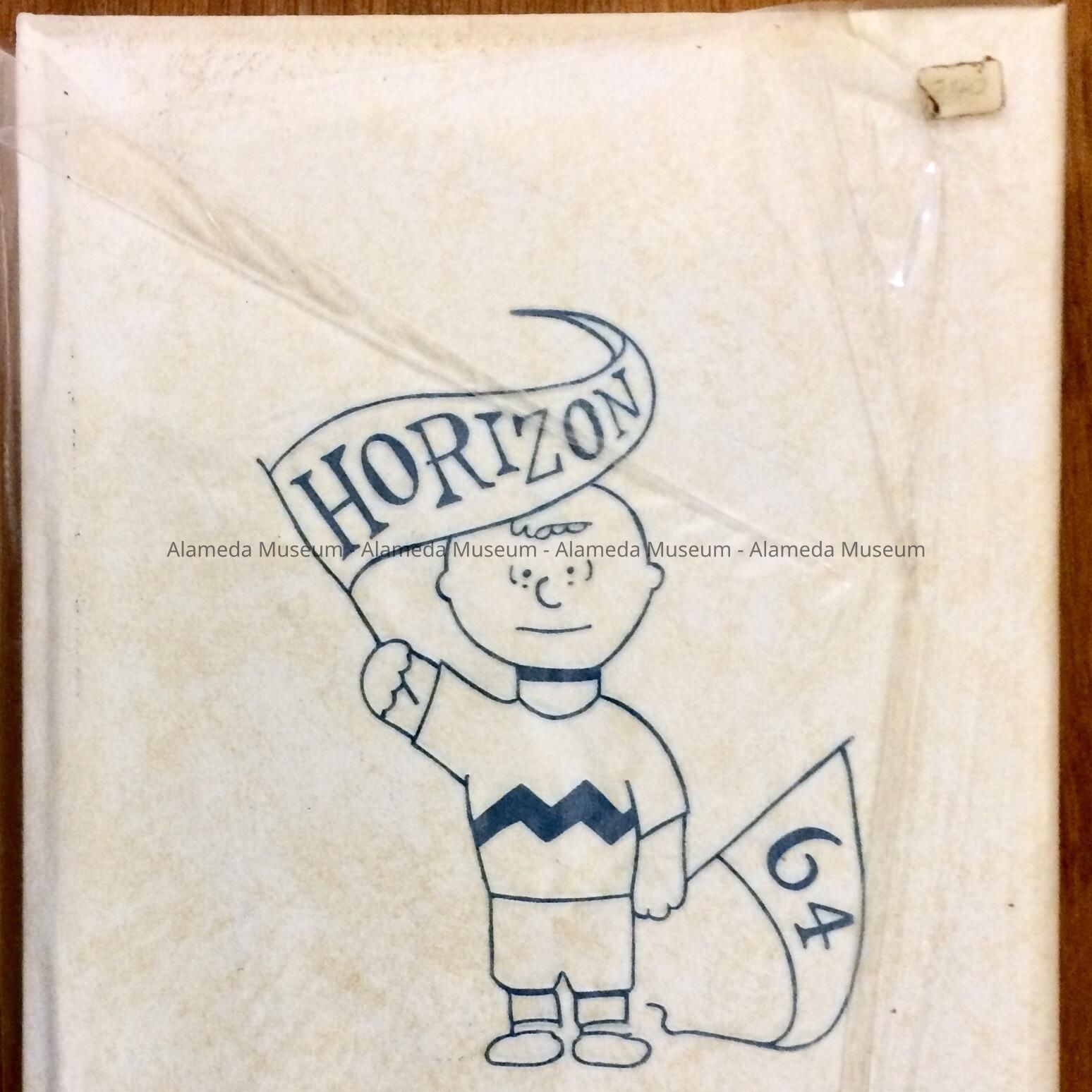 HARD-BOUND YEARBOOK, WITH COVER OF EMBOSSED PLASTIC. COVER BEARS A DECORATIVE DESIGN OF A "PEANUTS" CHARACTER HOLDING A BANNER WITH A CAPTION WHICH READS, "HORIZON," IN BLUE COLORED TYPE ON A WHITE-COLORED BACKGROUND.
