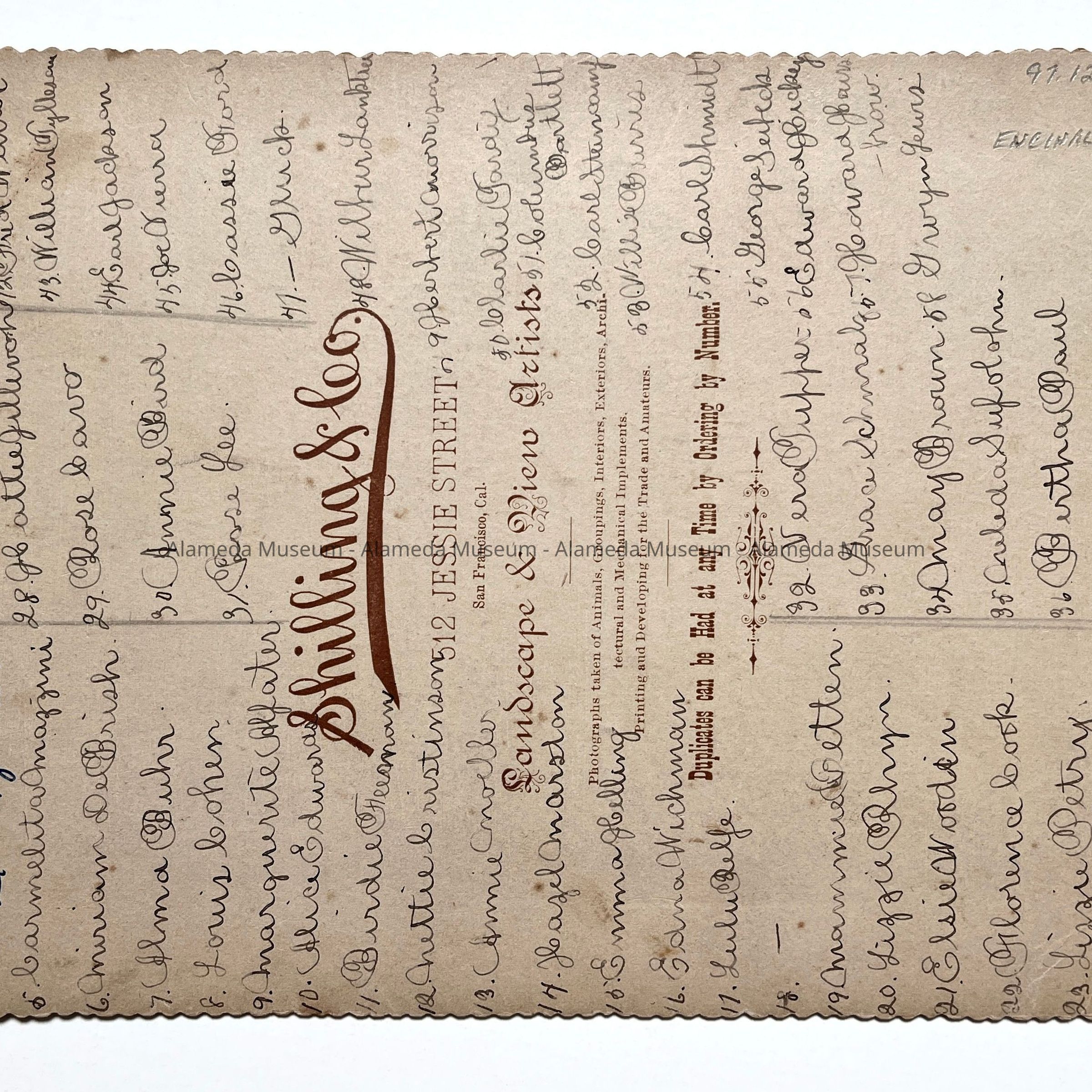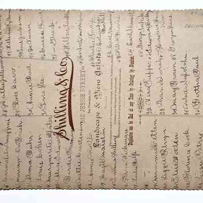 Description: Sepia-toned albumen print photo, mounted on tan paperboard. Photographer: Schilling & Co., S.F. (as imprinted in brown ink at the bottom of the mounting). The mounting has some chipping on its edges, plus some foxing. The image has a lower case letter "a" written in blue ink onto its center.