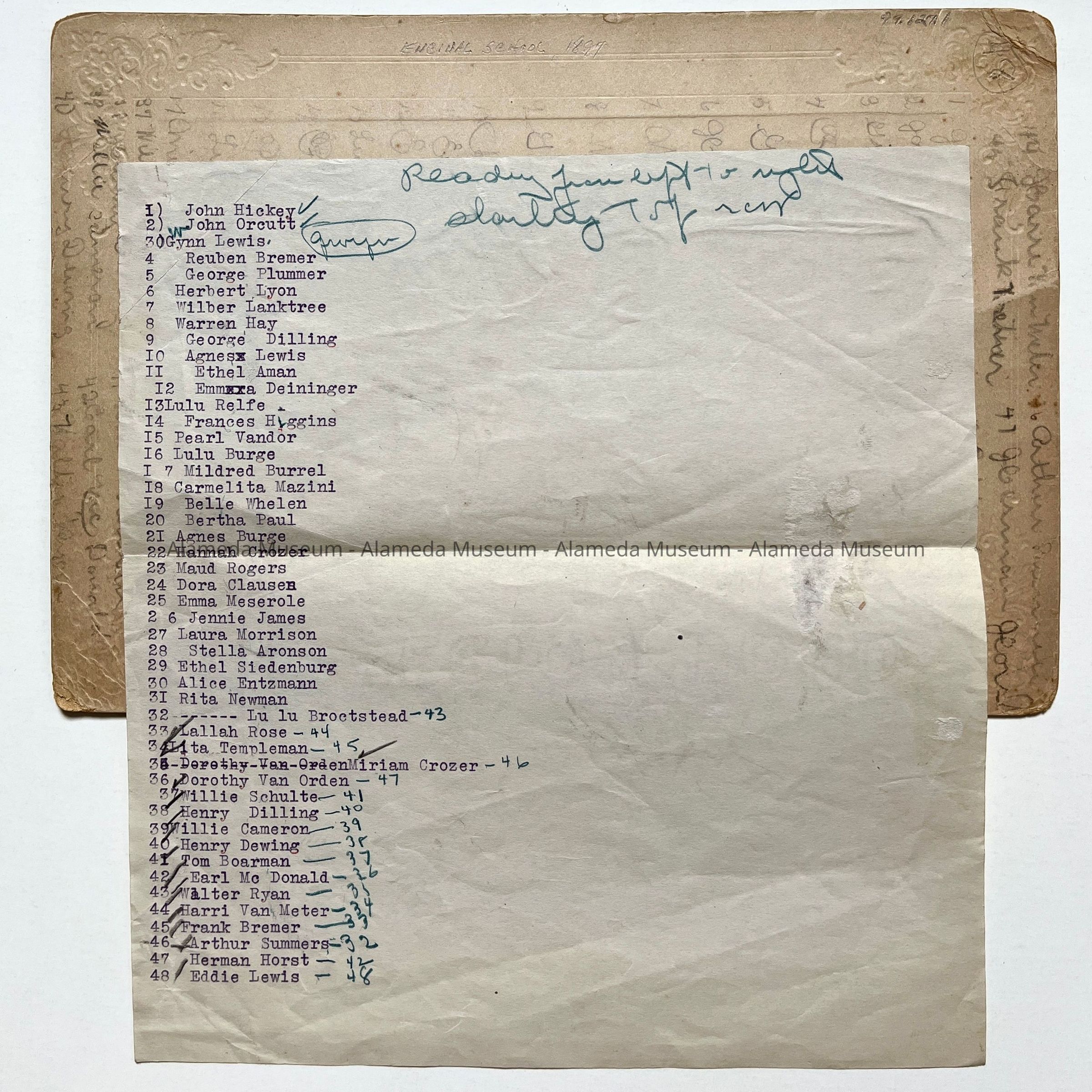 History of Object: Encinal School class picture (grade unknown), 1897. Class Members are identified on a typewritten list on the verso.