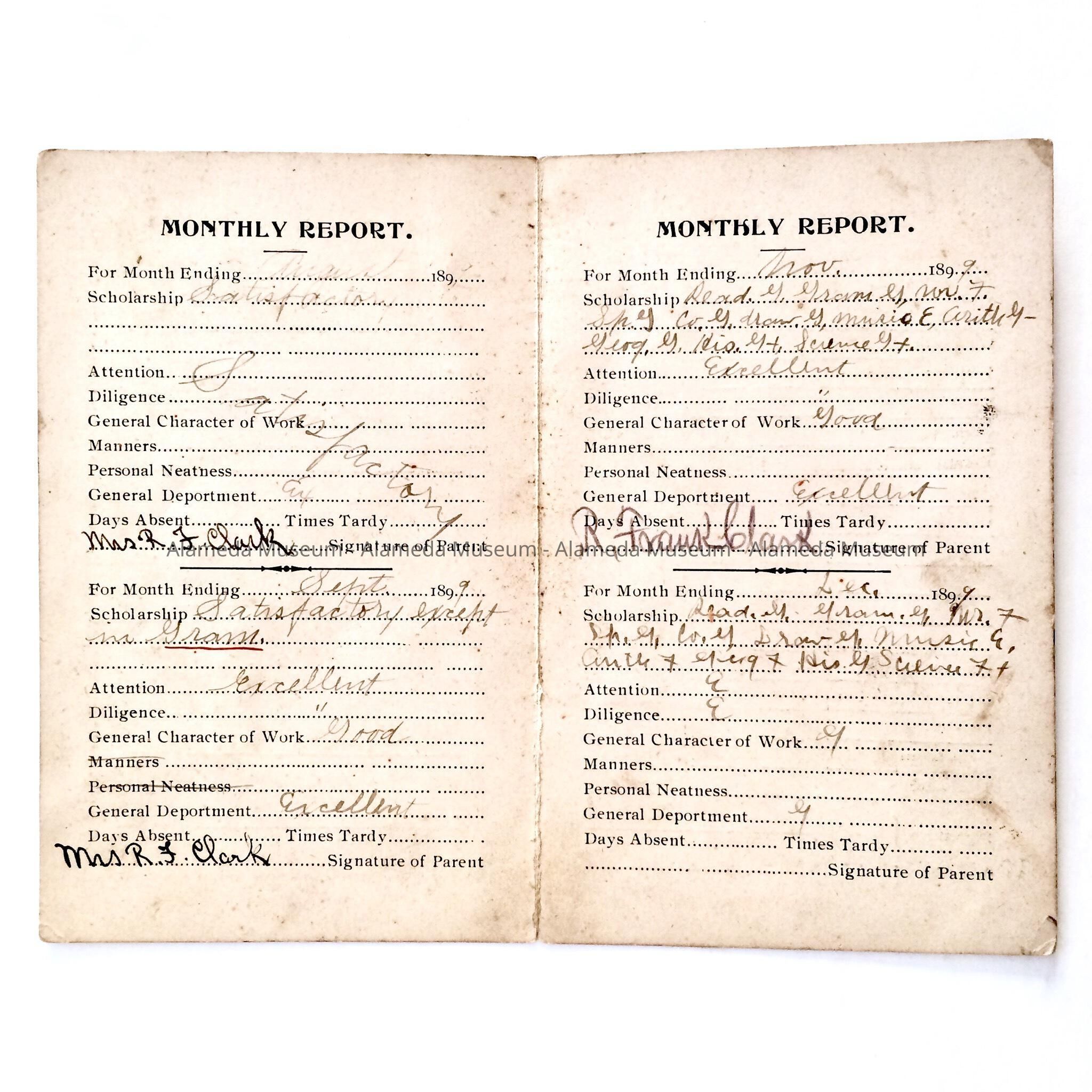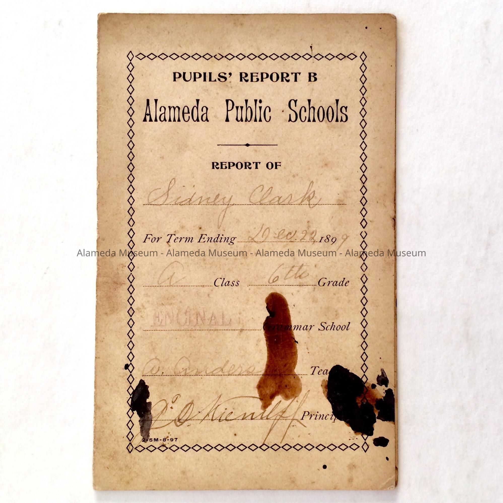 History of Object: A report card for Sidney Clark from Encinal School (Mastick after 1901). Sidney was the son of R. Frank Clark, an early resident of the city, residing at 1724 Alameda Ave. (which they sold in 1886). Clark was the father of Herbert D. Clark, insurance agent, and Eleanor, who eventually became the executive director of the Alameda Branch of the American Red Cross. (There are artifacts in the museum representing this prominent family.)