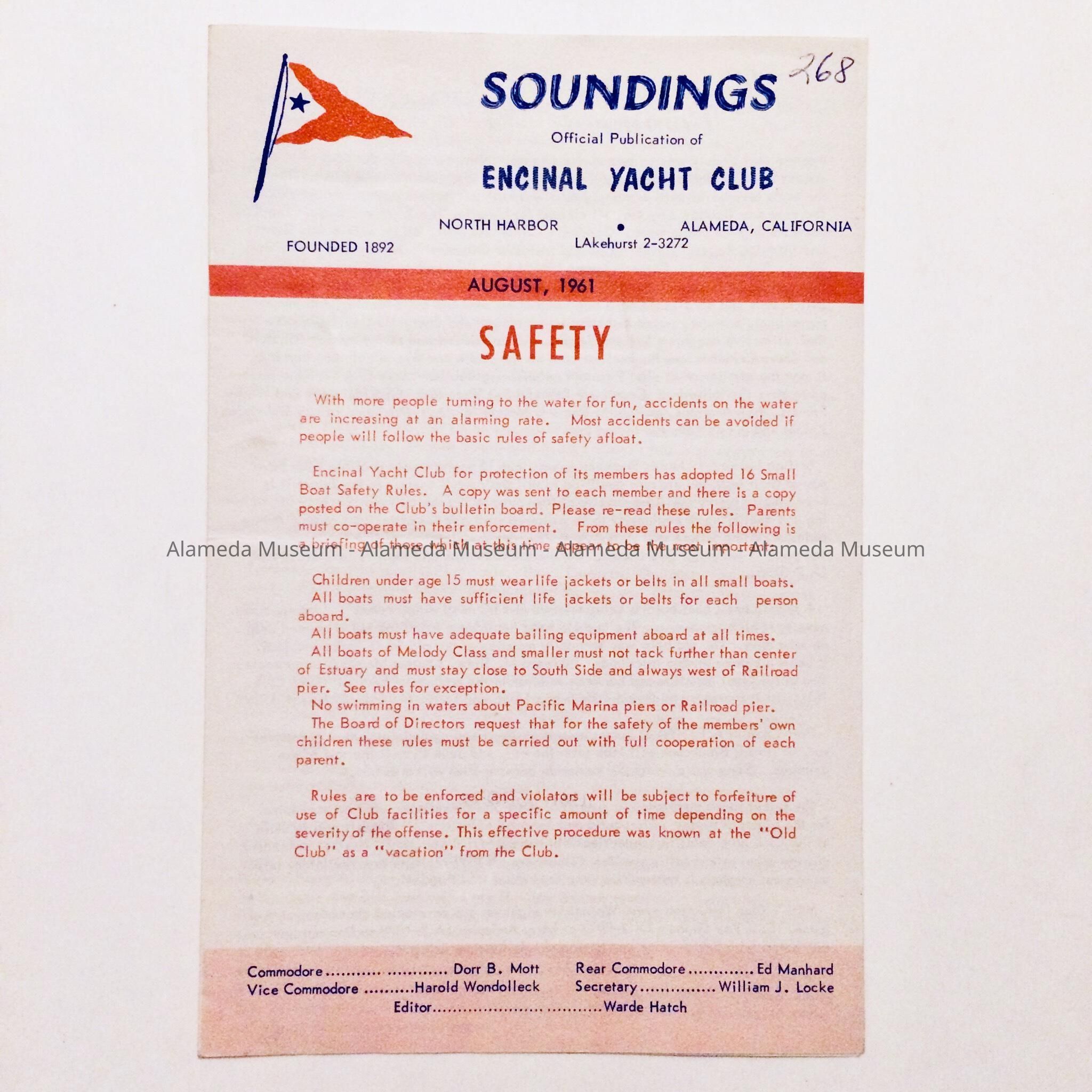 History of Object: Newsletter (Two Copies) of the Encinal Yacht Club publication “Soundings”. The organization was founded in 1892. The newsletter includes events for the month of August 1961.