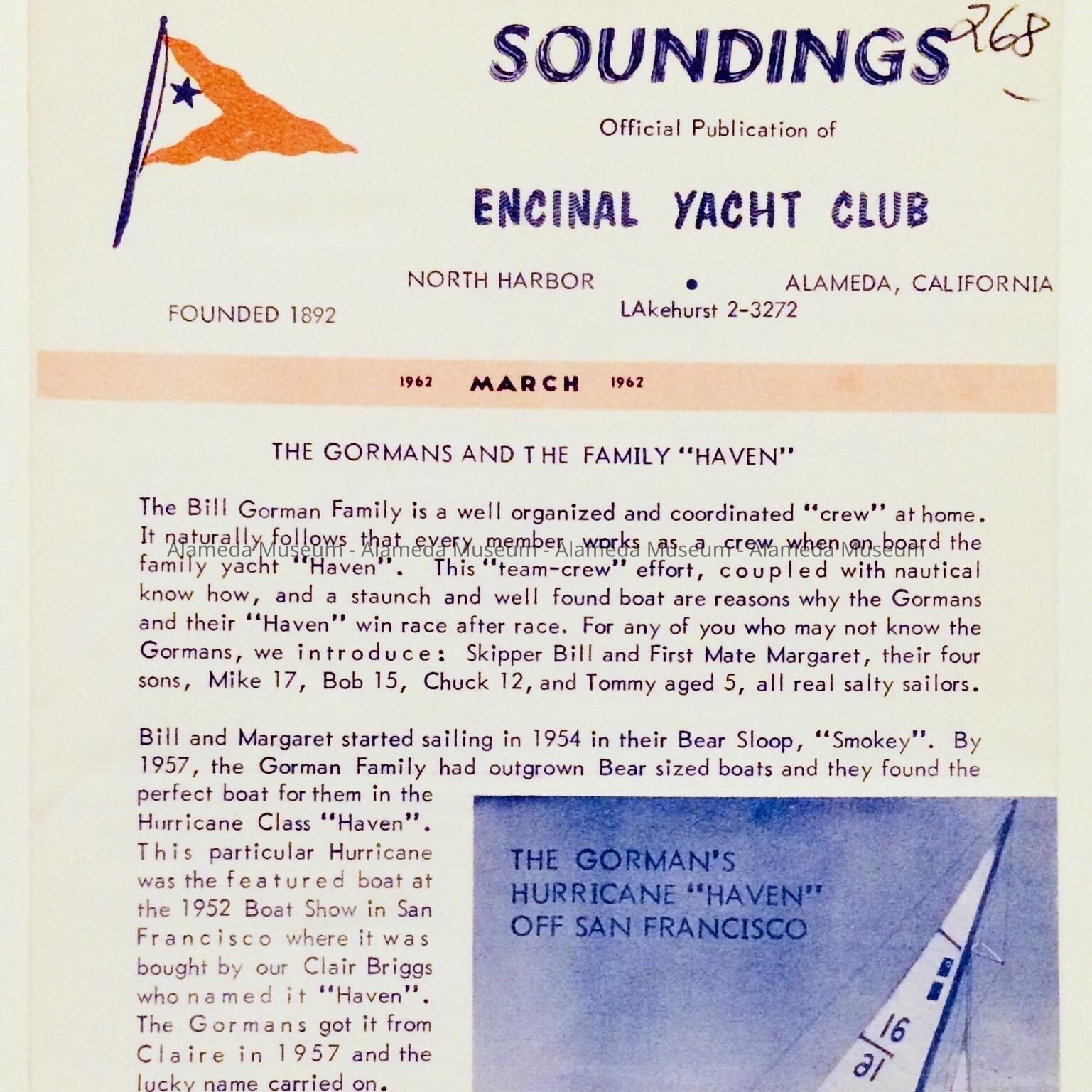 History of Object: Newsletter of the Encinal Yacht Club publication “Soundings". The newsletter includes events for the month of March 1962.